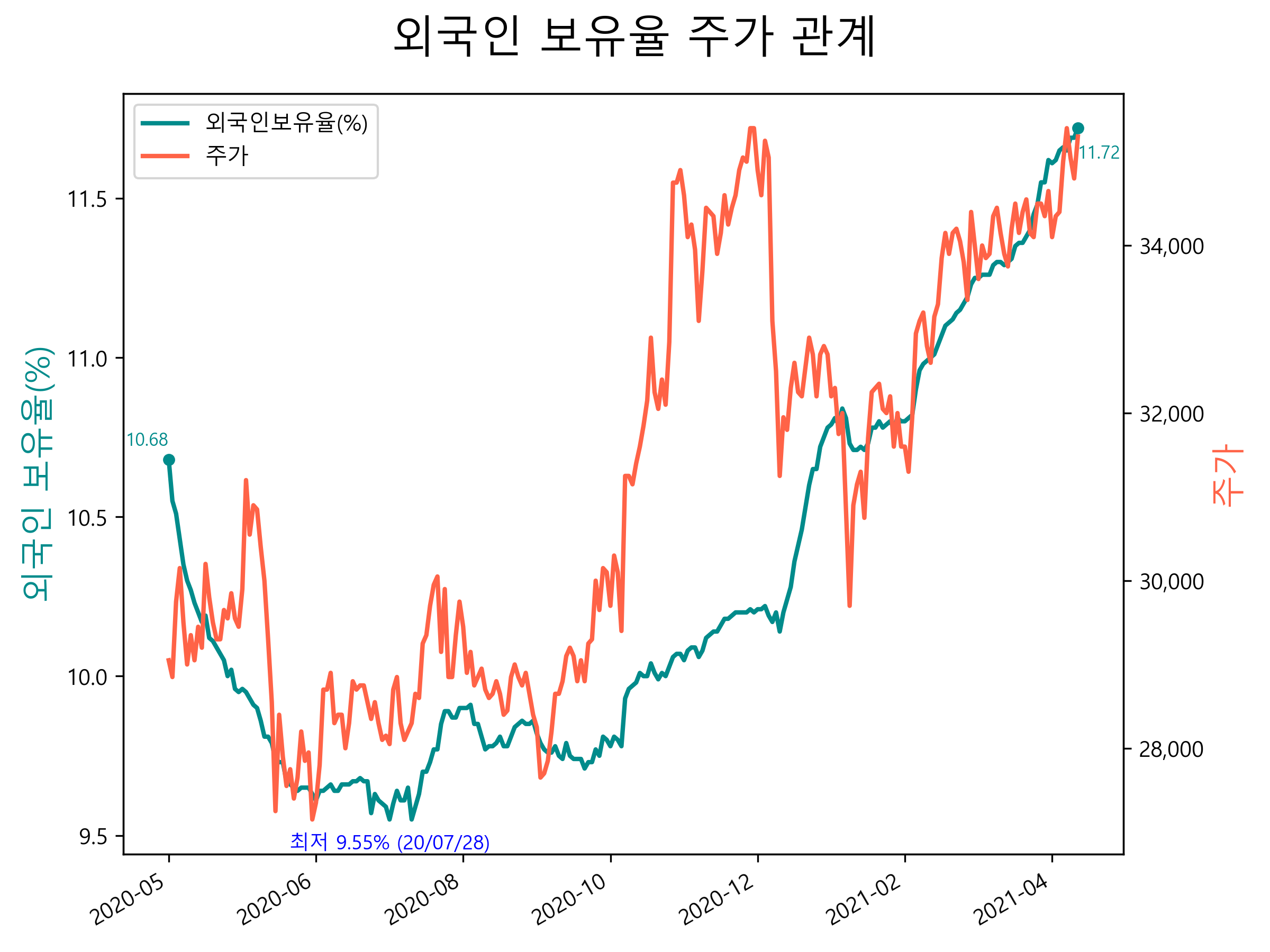 최근 1년간 외국인 보유율 및 주가와의 관계입니다.