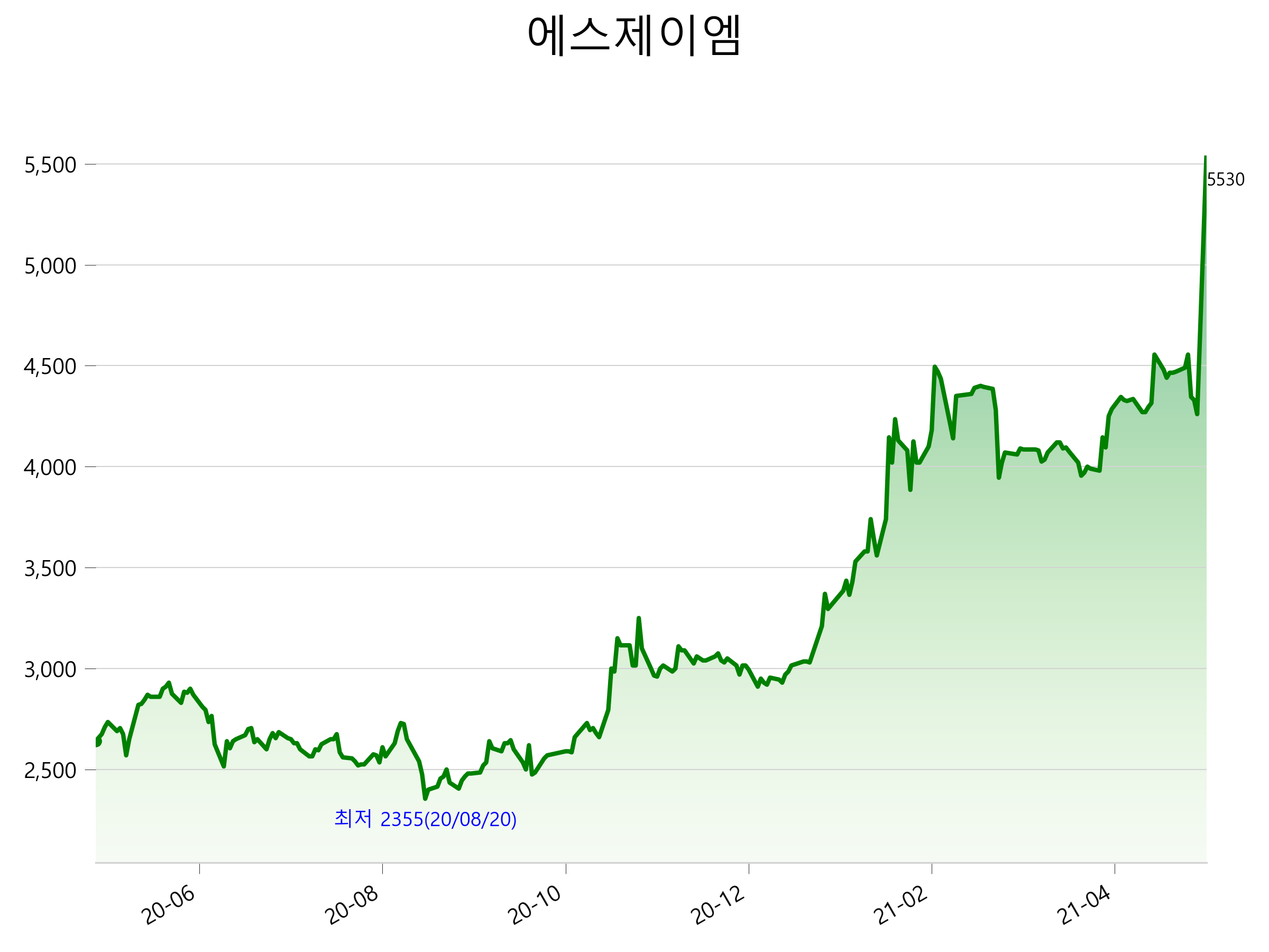 52주 최고가는 5,530원(2021-05-03), 52주 최저가는 2,355원(2020-08-20)으로 52주간 주가 상승률은 109.5% 입니다.