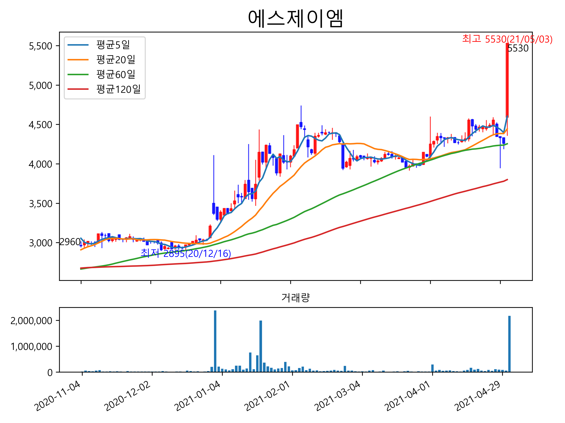 최근 6개월간 캔들차트 및 이동평균선입니다.
