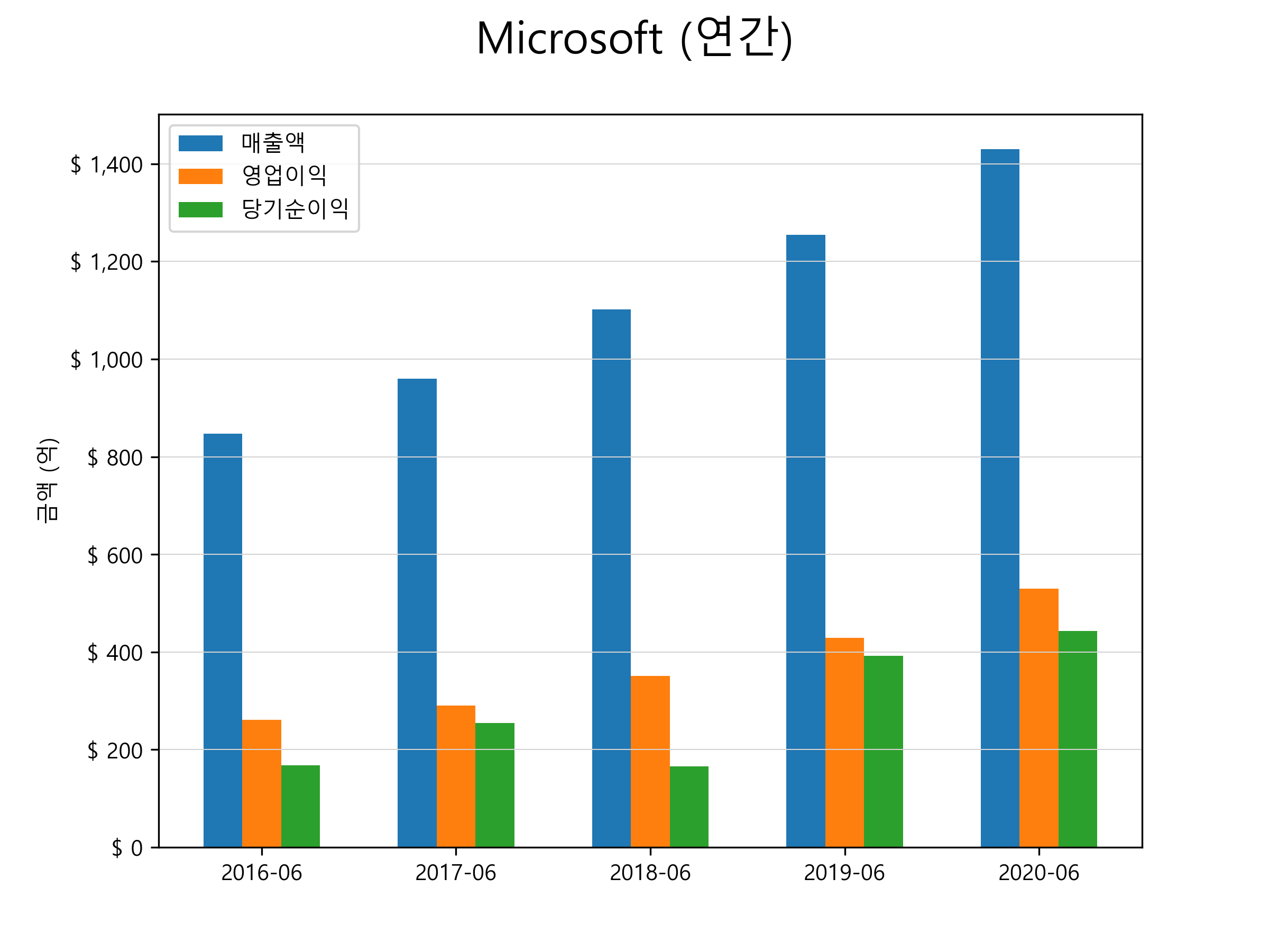 마이크로소프트의 2020년 매출은 1430.2억달러(약 160조 4970억원), 영업이익 529.6억달러(약 59조 4317억원), 당기순이익 442.8억달러(약 49조 6910억원)을 기록했습니다. 연간별 매출 및 영업이익, 당기순이익 표입니다.