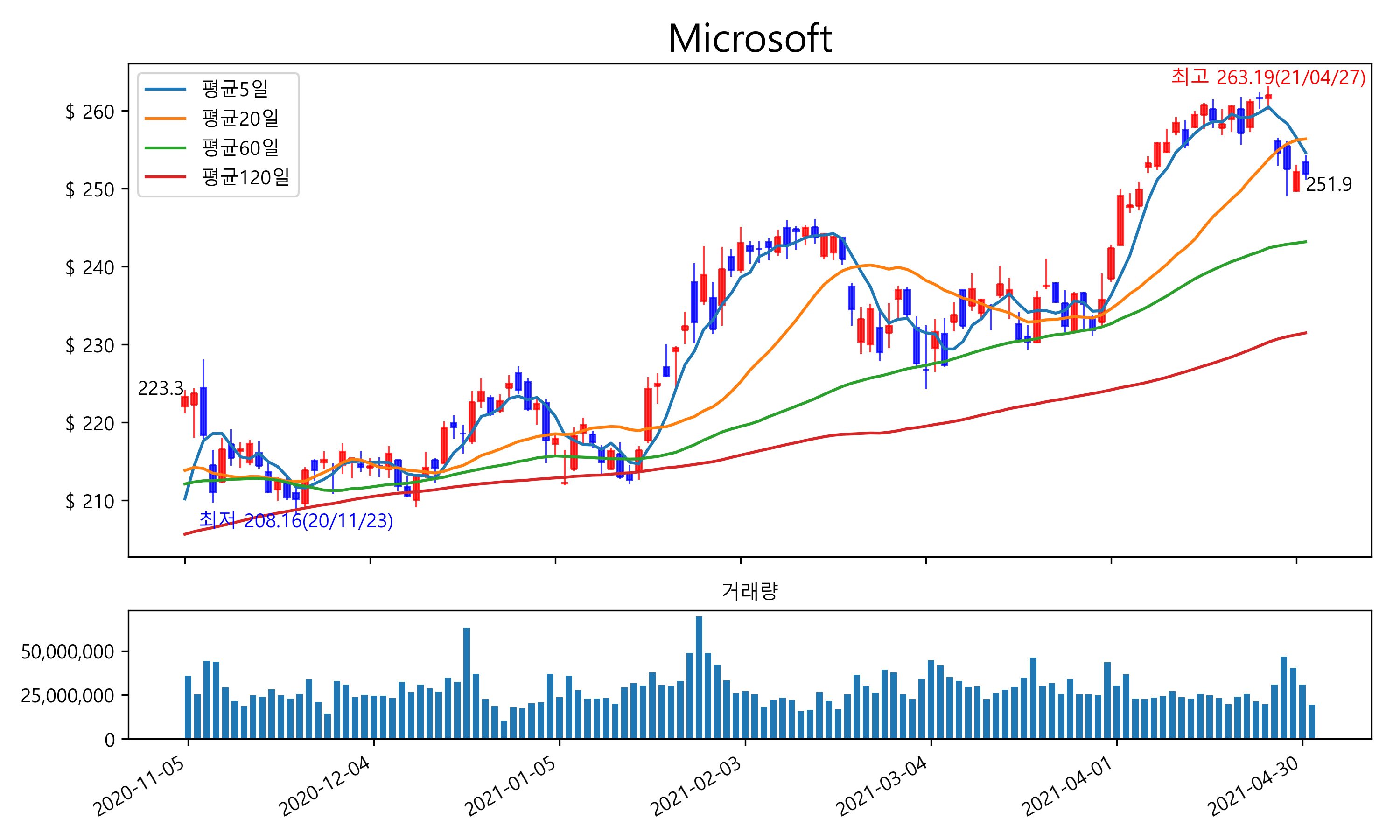 최근 6개월간 캔들차트 및 이동평균선입니다.
