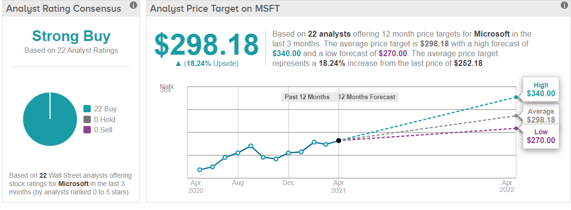 마이크로소프트의 미국 투자자들의 투자의견입니다. 지난 3개월 동안 총 22명의 애널리스트가 목표가를 추정하였습니다. 목표주가는 $298.18로 현재주가 $252.18보다 18.24% 상승할 것으로 전망했습니다. 가장 높은 목표주가는 $340.00이며, 가장 낮은 목표주가는 $270.00입니다.