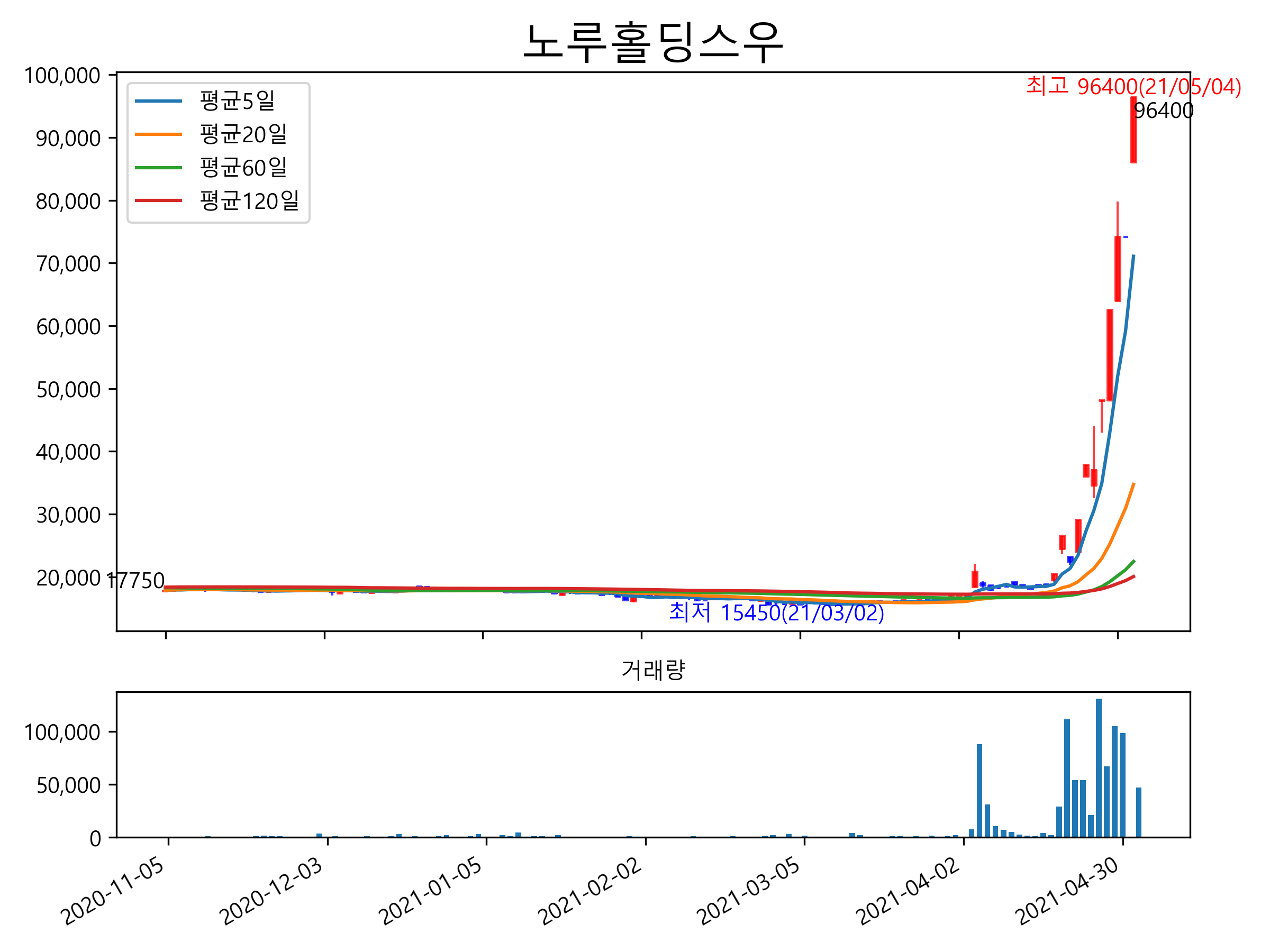 노루홀딩스우는 최근 급격한 상승세로 한국거래소가 투자경고 종목으로 지정하여 5월 3일에는 거래정지 되기도 했습니다. 거래정지가 풀린 5월 4일에도 상한가를 기록했습니다.