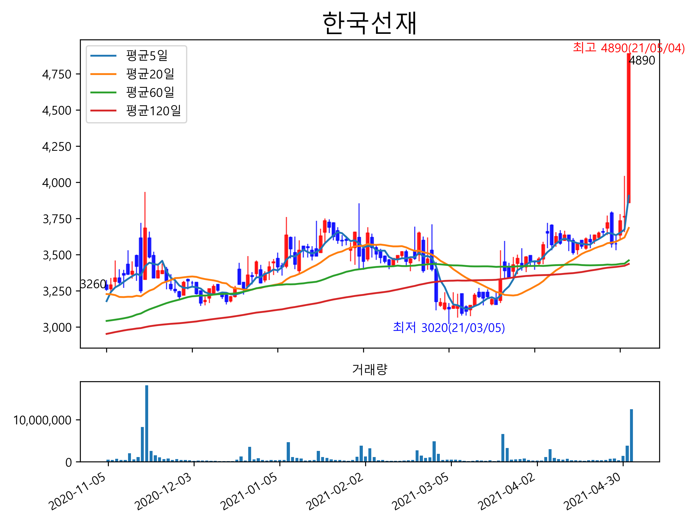 최근 6개월간 캔들차트 및 이동평균선입니다.