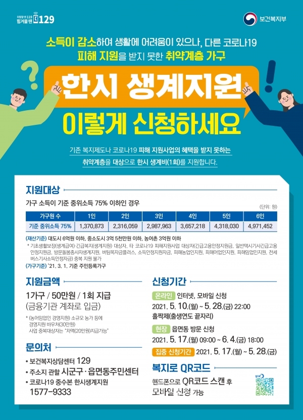 2021년 추경안으로 4차 재난지원금 중 저소득층에 대해서 한시생계지원금이 지급됩니다. 코로나19 장기화에 따라 올해 1~5월 소득감소로 생계가 곤란한 저소득가구를 지원하기 위한 한시 생계지원 사업을 추진하게 되는데 한시생계지원금 대상 및 신청방법에 대해서 알려드리겠습니다.