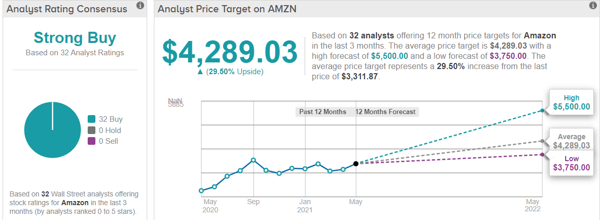 아마존의 미국 투자자들의 투자의견입니다. 지난 3개월 동안 총 32명의 애널리스트가 목표가를 추정하였습니다. 목표주가는 $4,289.03로 현재주가 $3,311.87보다 29.50% 상승할 것으로 전망했습니다. 가장 높은 목표주가는 $5,500.00이며, 가장 낮은 목표주가는 $3,750.00입니다.