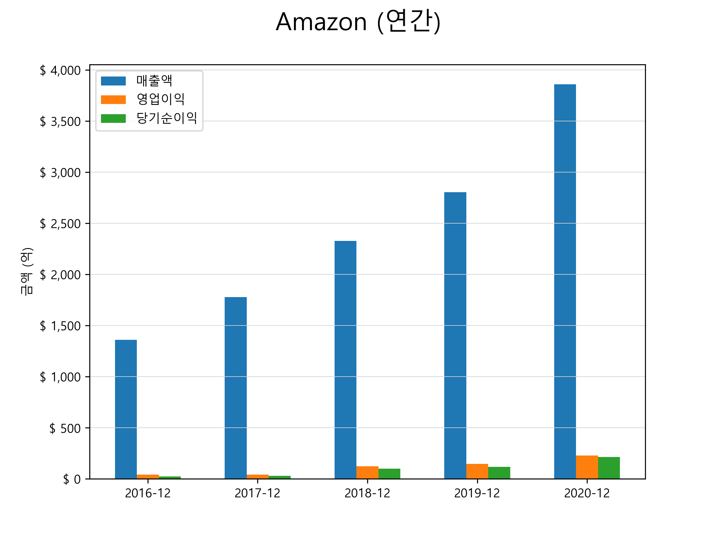 아마존의 2020년 매출은 3860.6억달러(약 434조 7036억원), 영업이익 229.0억달러(약 25조 7854억원), 당기순이익 213.3억달러(약 24조 0176억원)을 기록했습니다. 연간별 매출 및 영업이익, 당기순이익 표입니다.