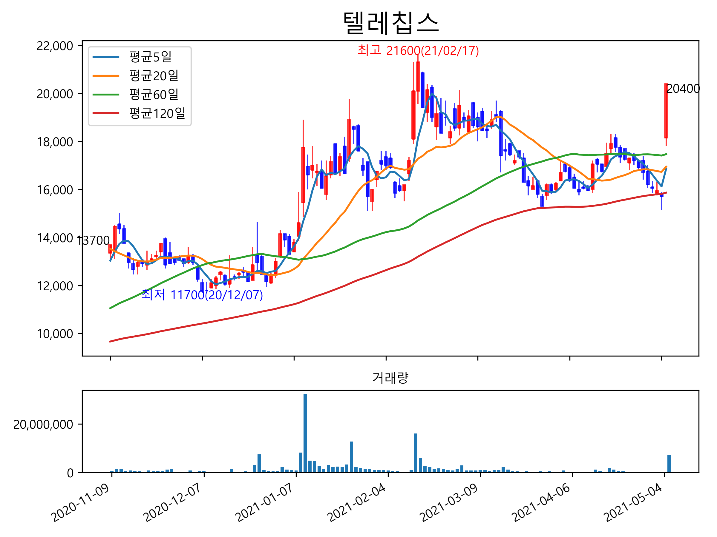 최근 6개월간 캔들차트 및 이동평균선입니다.