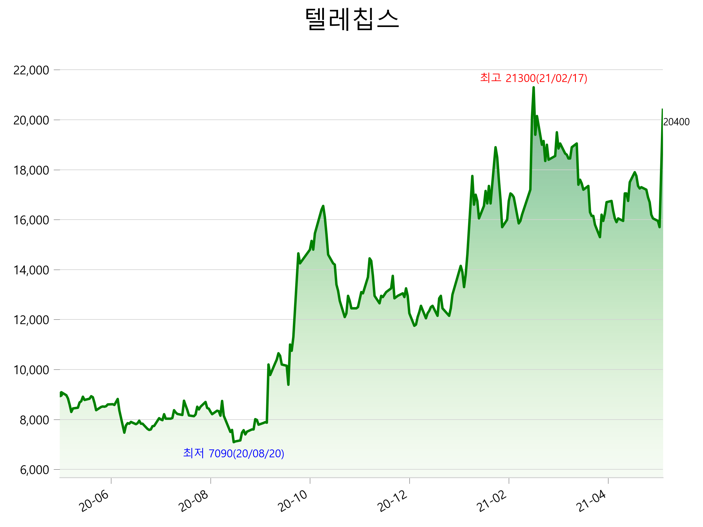 52주 최고가는 21,300원(2021-02-17), 52주 최저가는 7,090원(2020-08-20)으로 52주간 주가 상승률은 125.9% 입니다.