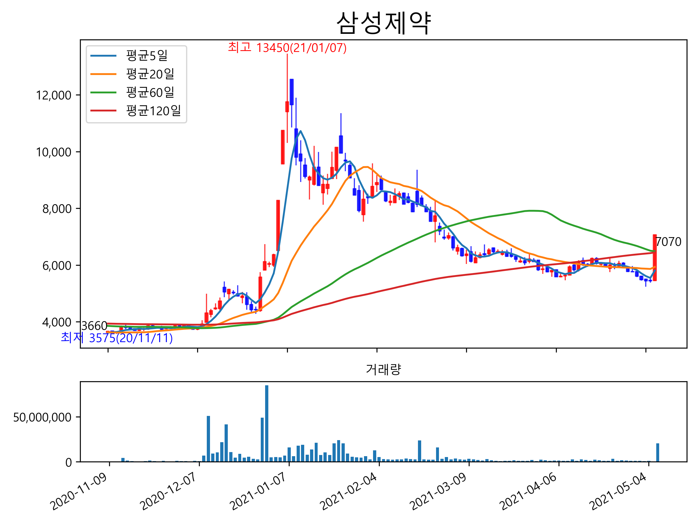 최근 6개월간 캔들차트 및 이동평균선입니다.