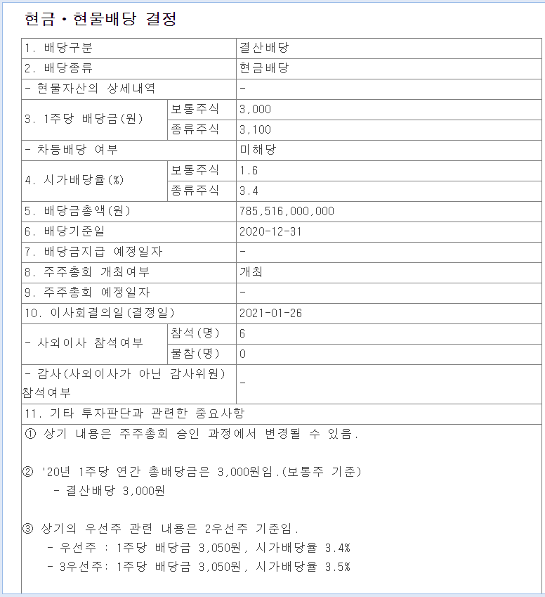 보통주는 3,000원, 우선주는 3,100원이 배당되며, 시가배당율은 보통주는 1.6%, 우선주는 3.4% 입니다. 배당금 총액은 7855억원 규모입니다.