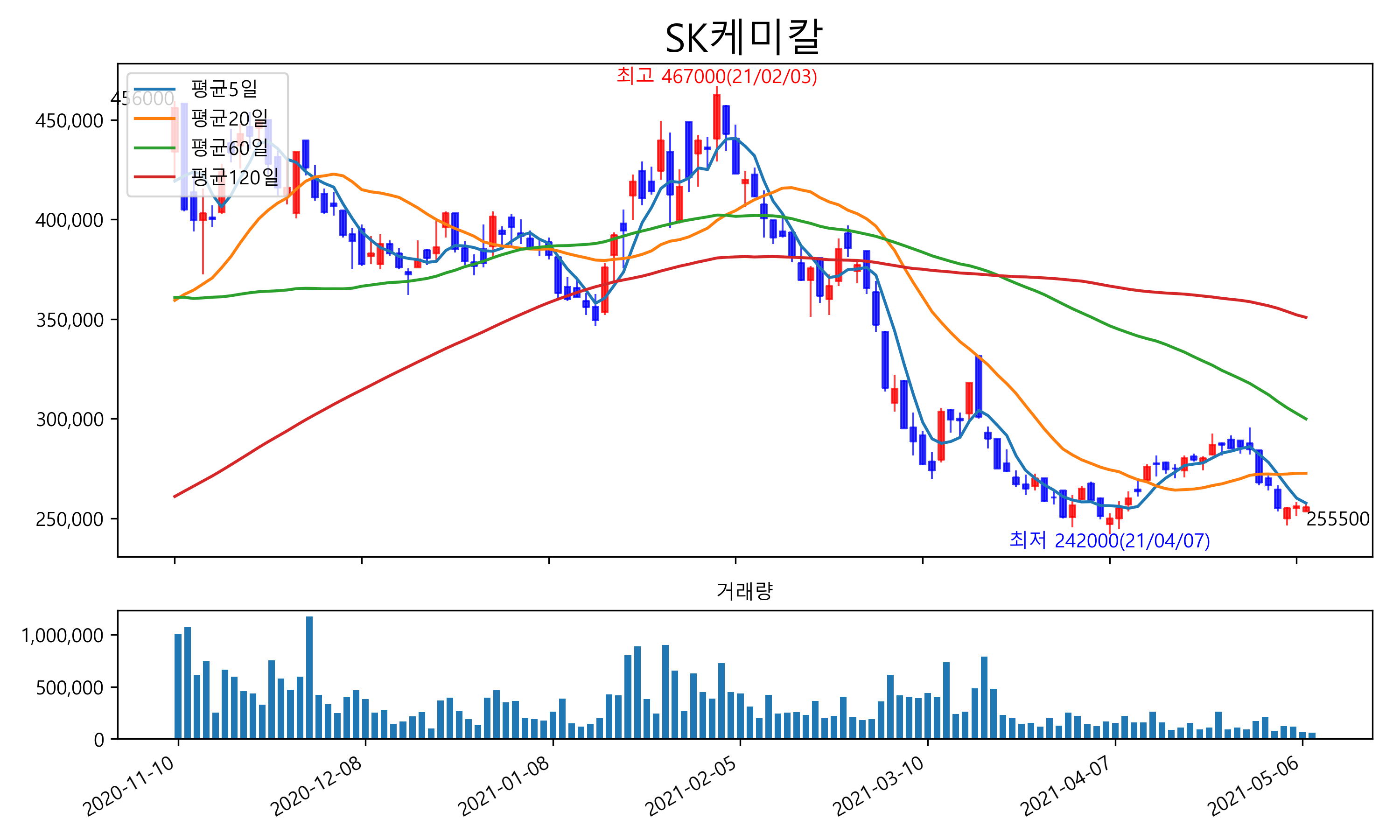 최근 6개월간 캔들차트 및 이동평균선입니다.