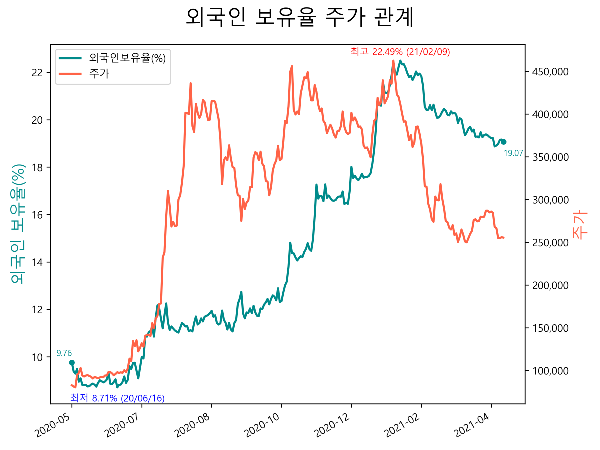 최근 1년간 외국인 보유율 및 주가와의 관계입니다.
