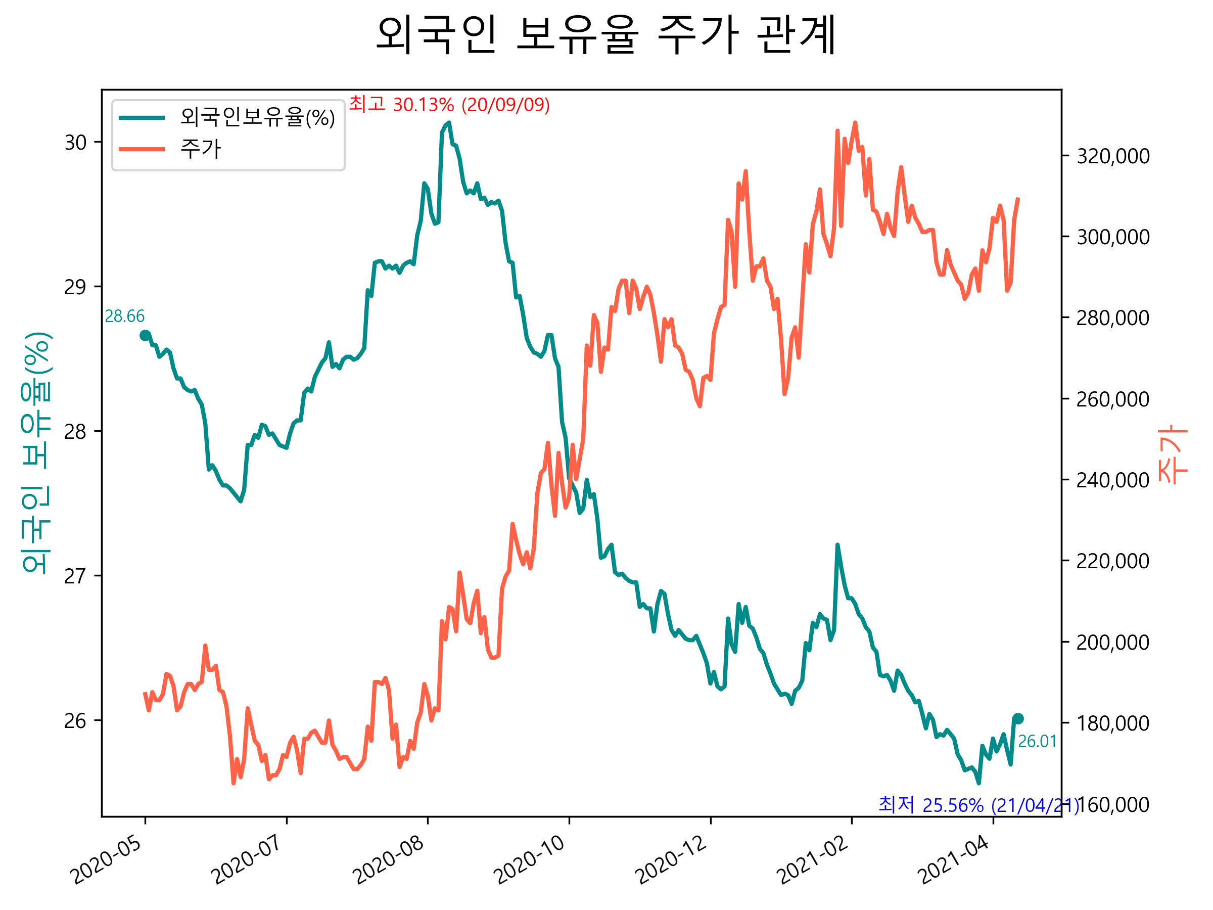 최근 1년간 외국인 보유율 및 주가와의 관계입니다.