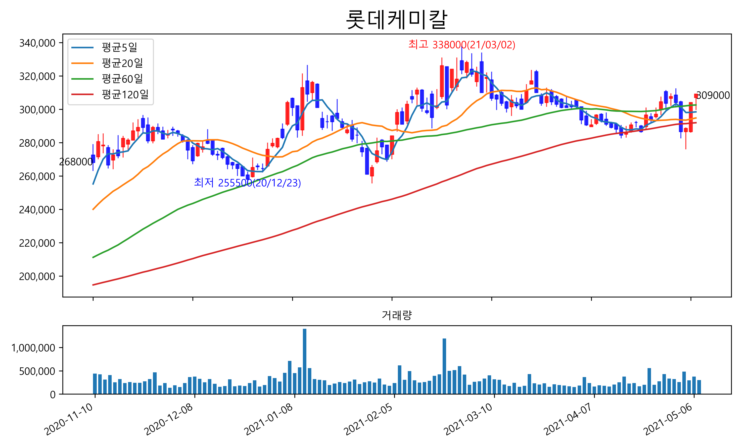 최근 6개월간 캔들차트 및 이동평균선입니다.