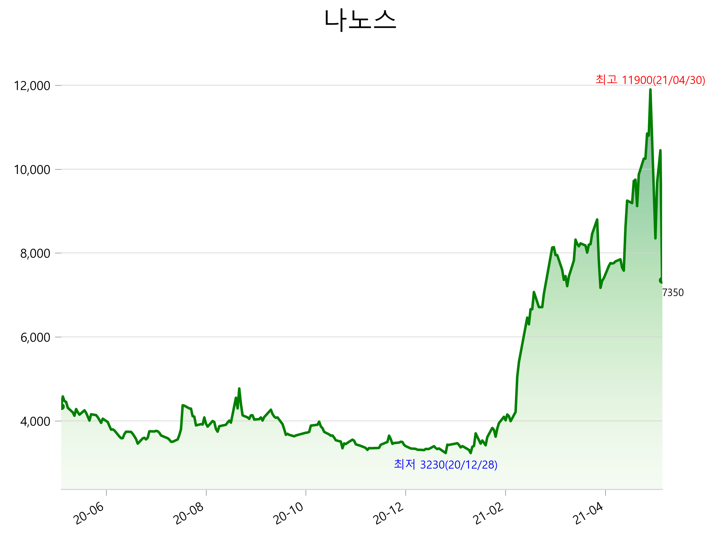 52주 최고가는 11,900원(2021-04-30), 52주 최저가는 3,230원(2021-01-12)으로 52주간 주가 상승률은 69.4% 입니다.