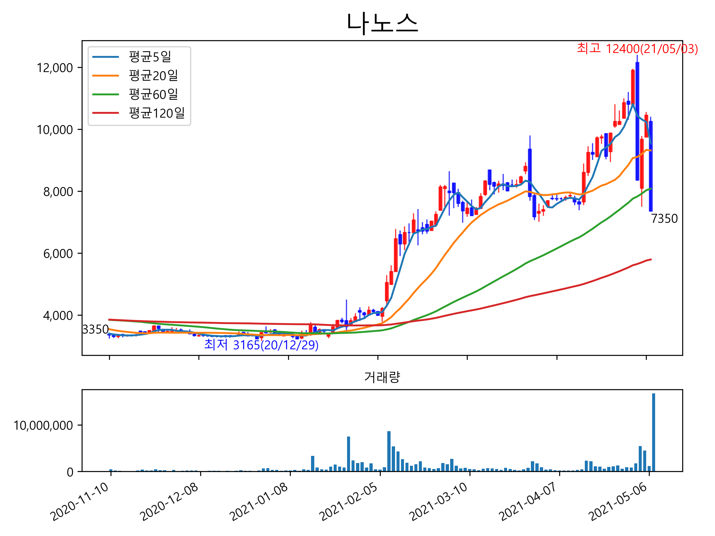 최근 6개월간 캔들차트 및 이동평균선입니다.