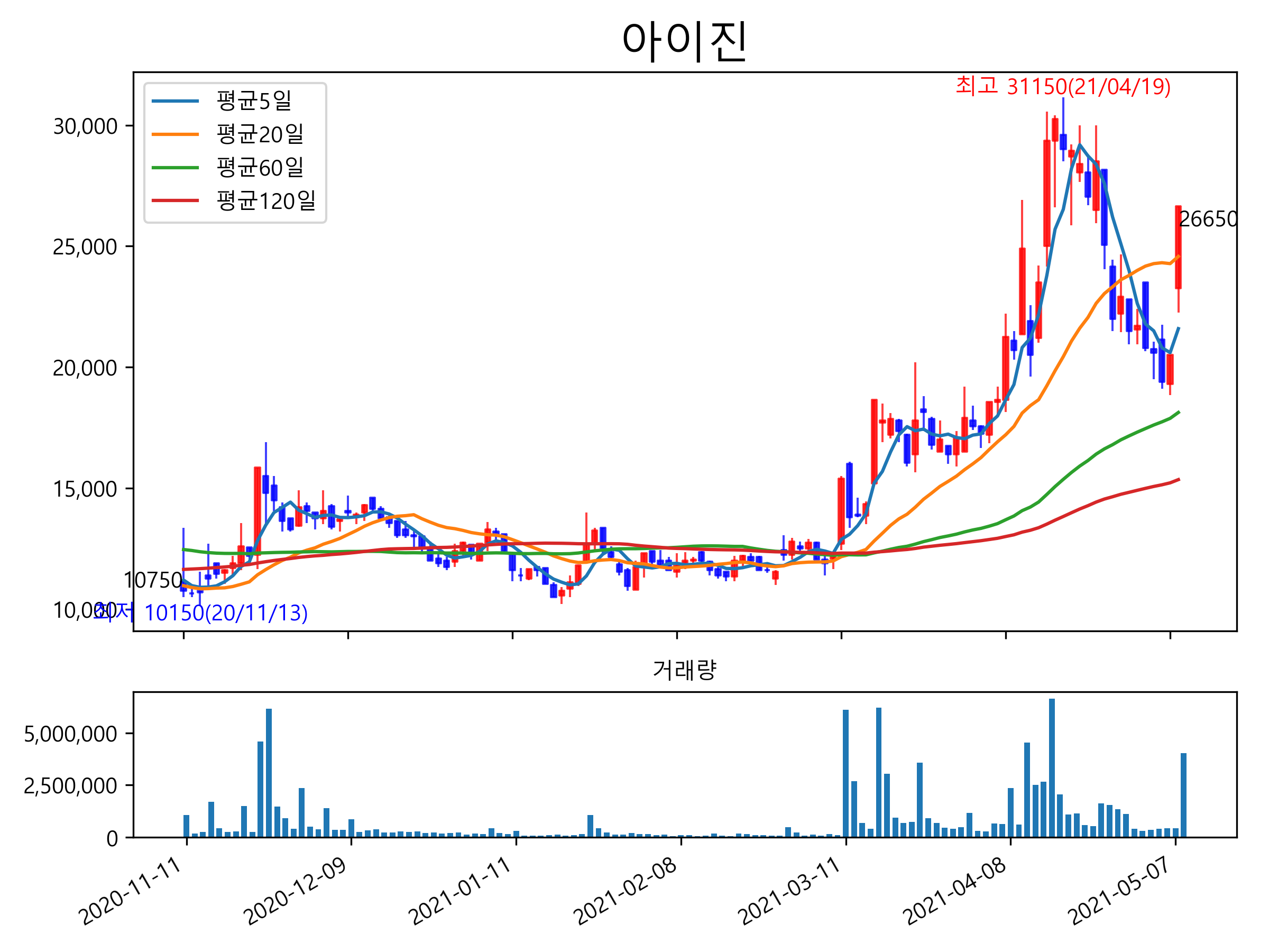 최근 6개월간 캔들차트 및 이동평균선입니다.