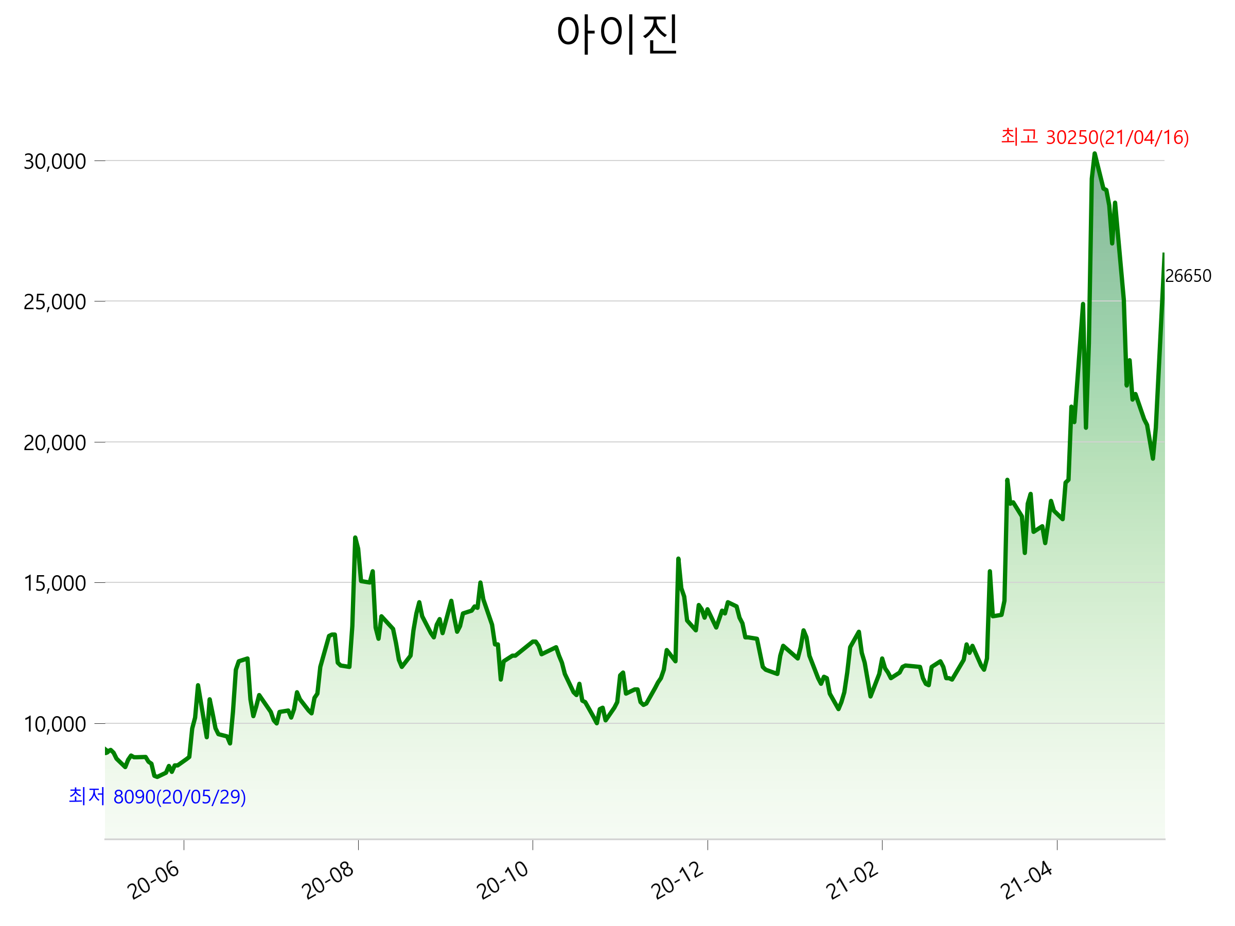 52주 최고가는 30,250원(2021-04-16), 52주 최저가는 8,090원(2020-05-29)으로 52주간 주가 상승률은 193.5% 입니다.