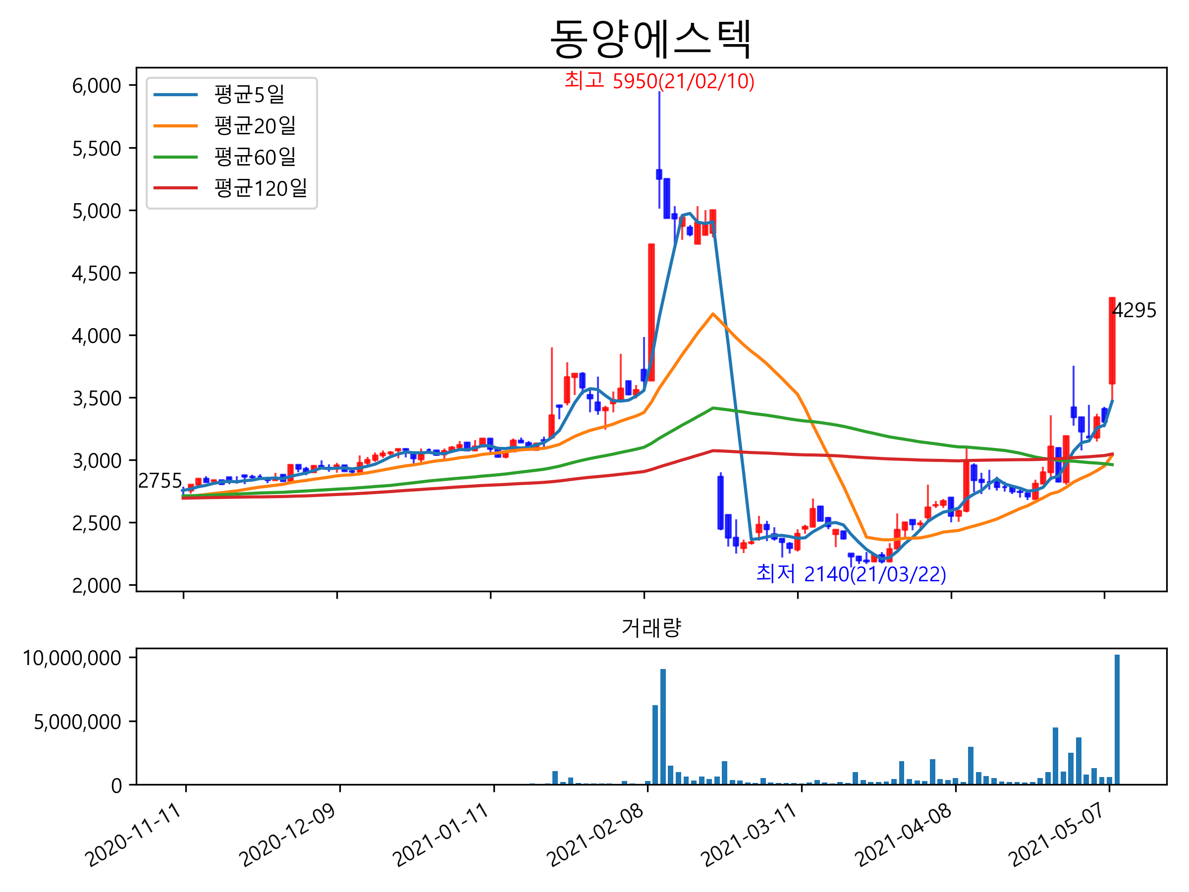 최근 6개월간 캔들차트 및 이동평균선입니다.
