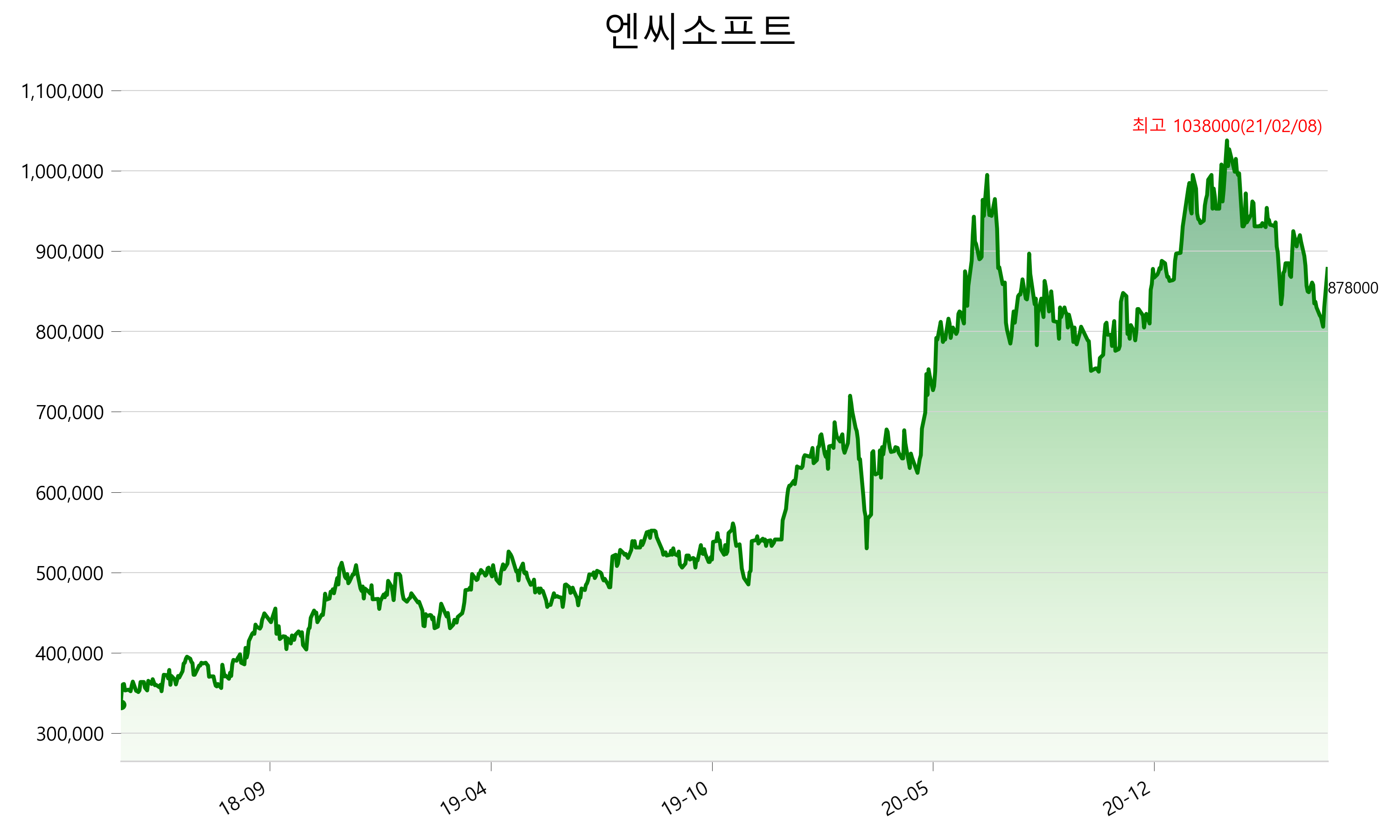 5월 10일 기준 주가는 878,000원 입니다. 아래는 최근 3년간의 주가흐름입니다.