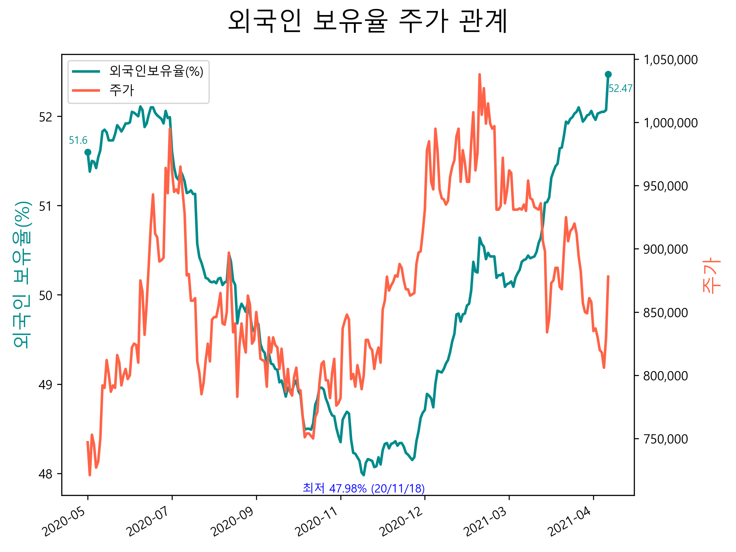 최근 1년간 외국인 보유율 및 주가와의 관계입니다.