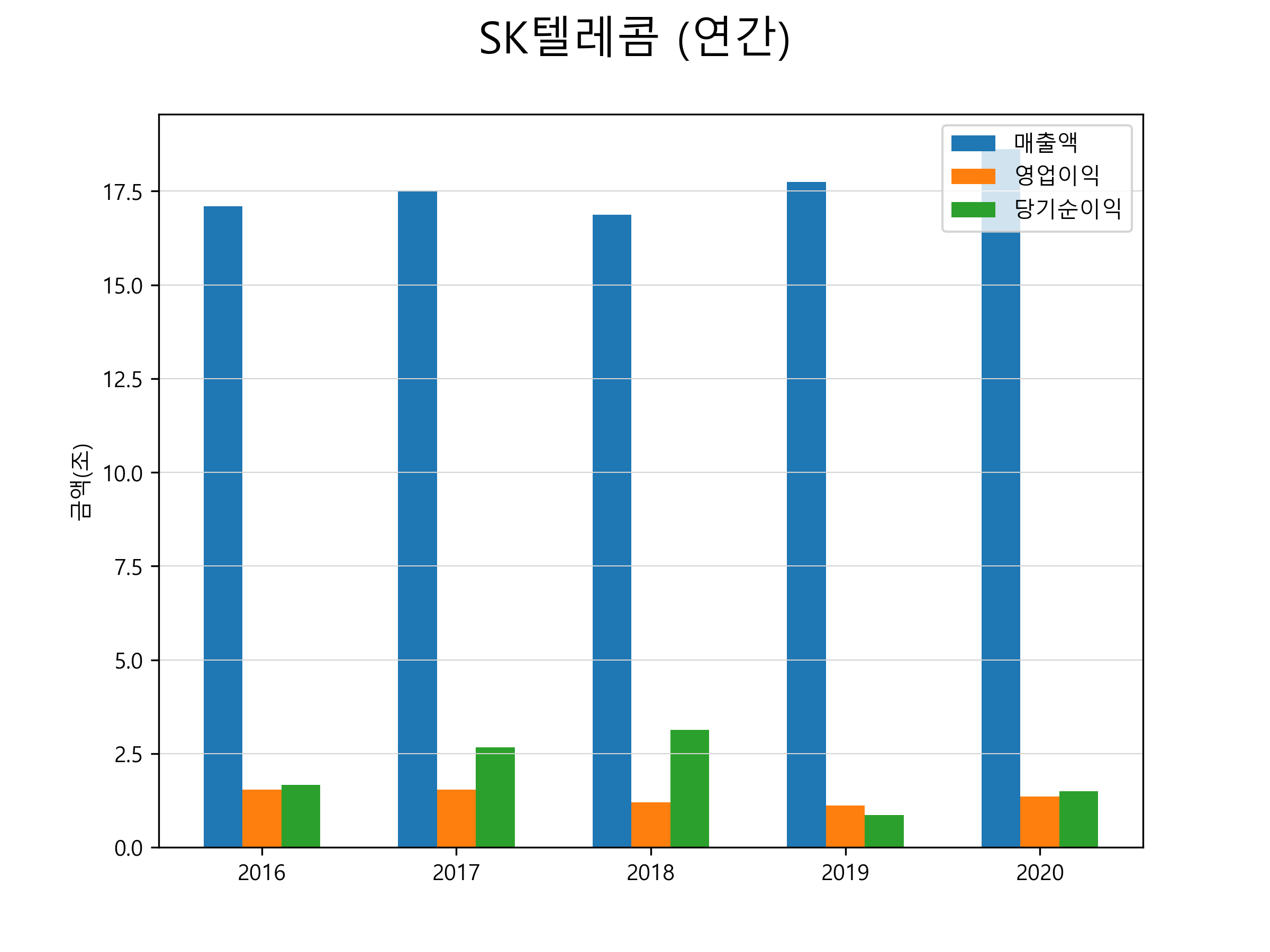 SK텔레콤의 최근 5년간 실적입니다. 2020년 매출은 18조 6247억원, 영업이익 1조 3493억원, 당기순이익 1조 5005억원을 기록했습니다. 연간 매출 및 영업이익, 당기순이익 표입니다.