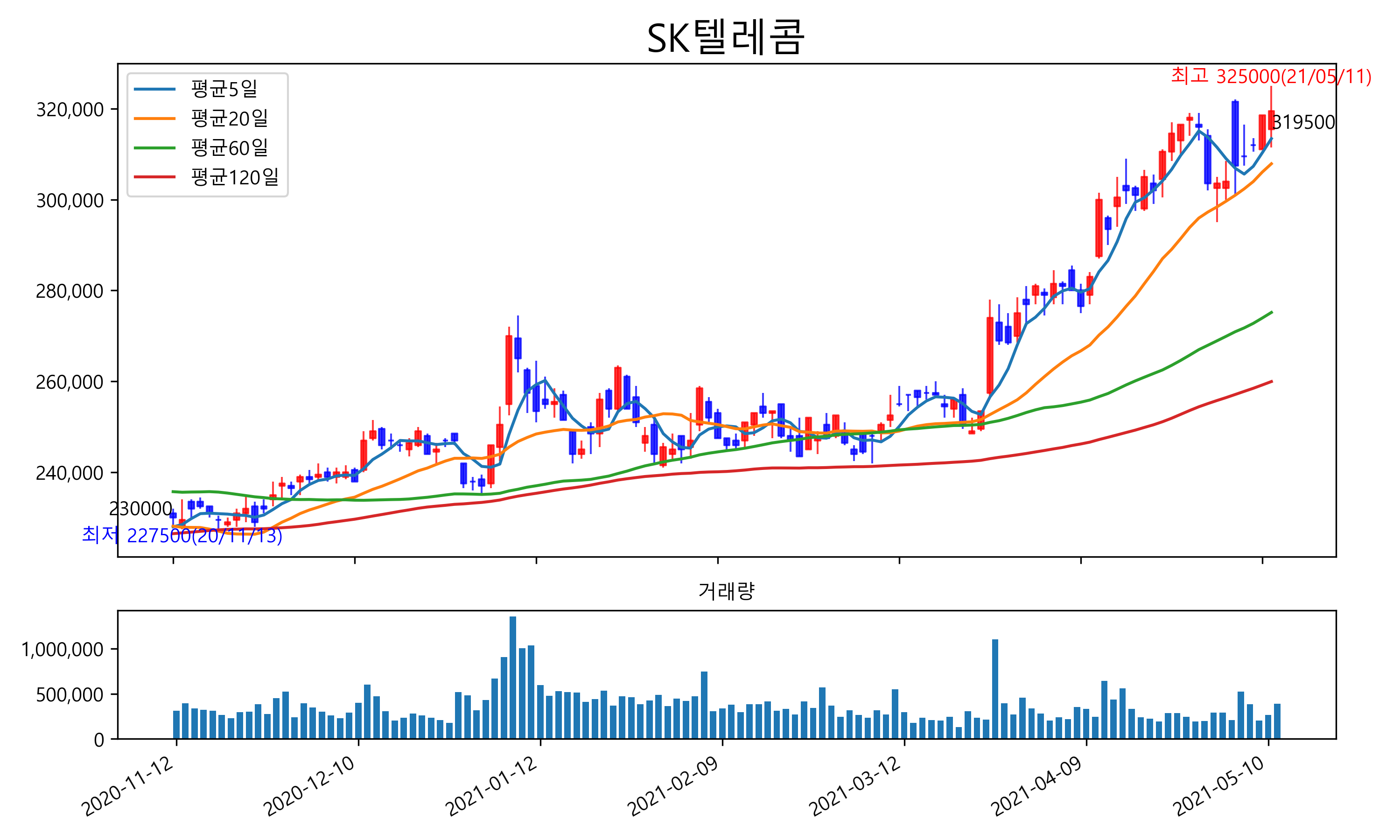 최근 6개월간 캔들차트 및 이동평균선입니다.