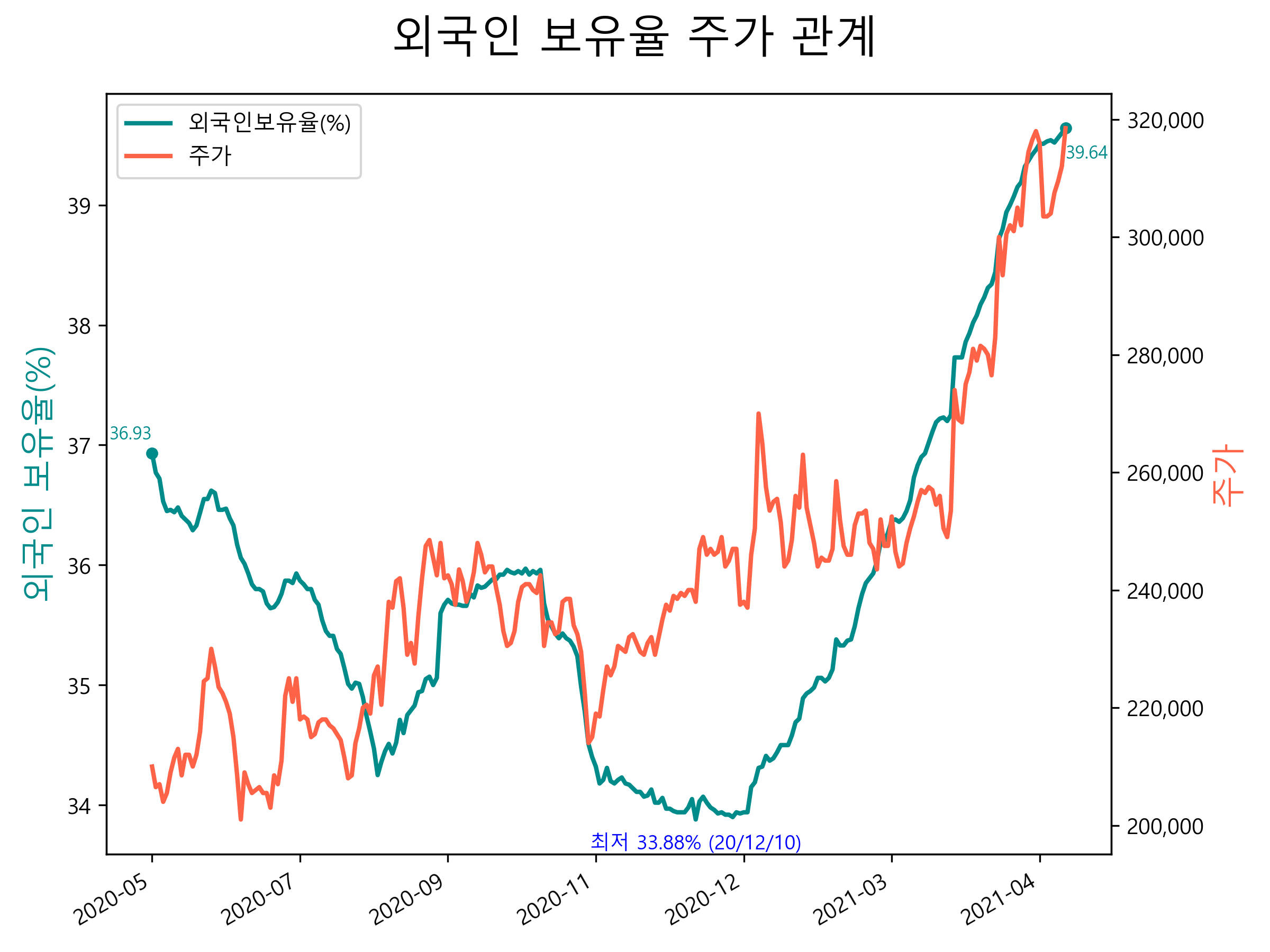 최근 1년간 외국인 보유율 및 주가와의 관계입니다.