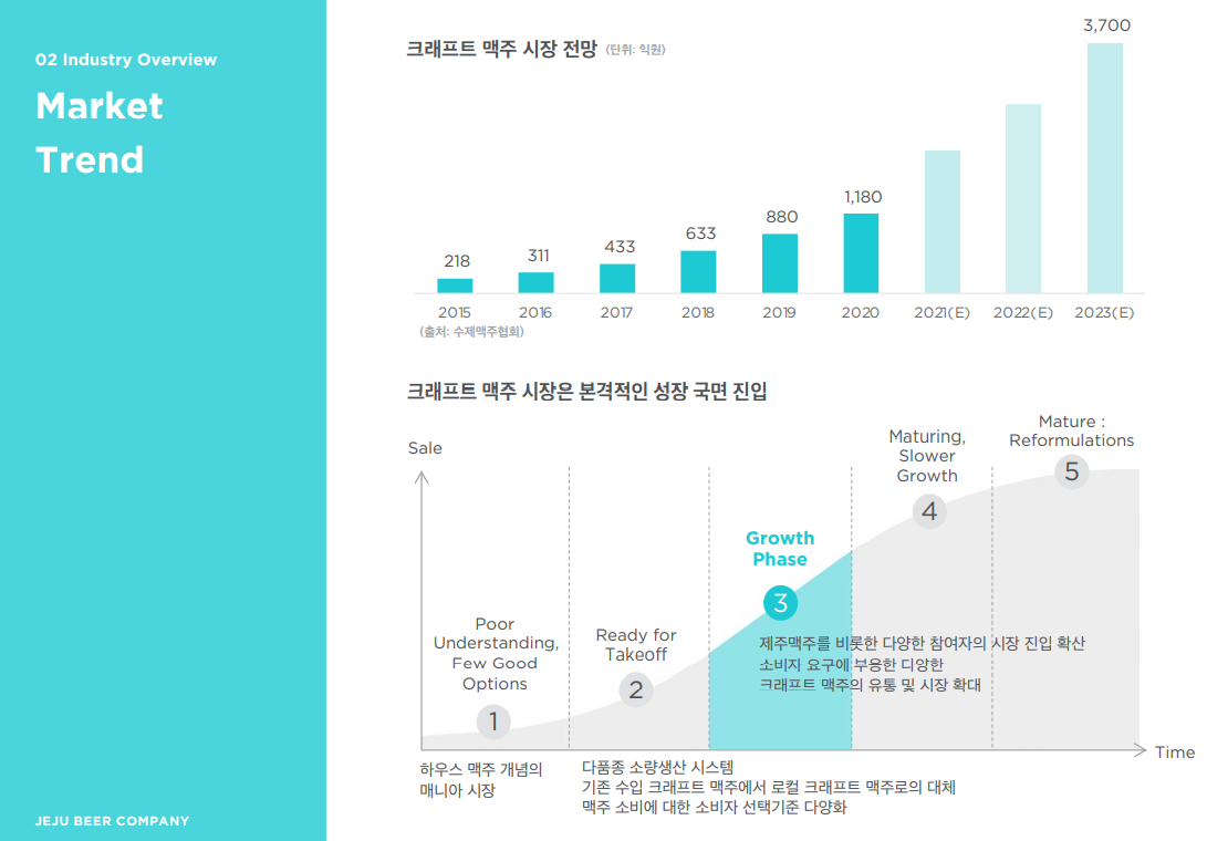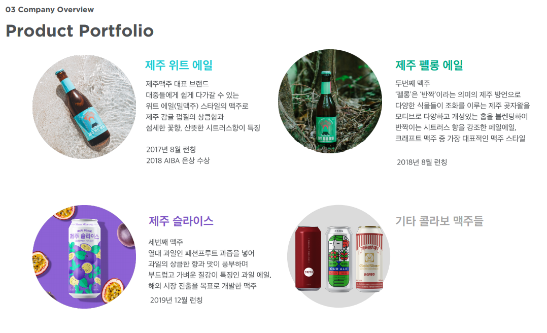 제주맥주는 미국 유명 수제맥주사 '브루클린 브루어리'의 아시아 첫 자매기업으로 제주위트에일, 제주펠롱에일 등을 출시해 인기를 끌었습니다. 2020년 매출이 전년에 비해 3배 가까이 증가하는 등 성장세를 보여주고 있습니다.