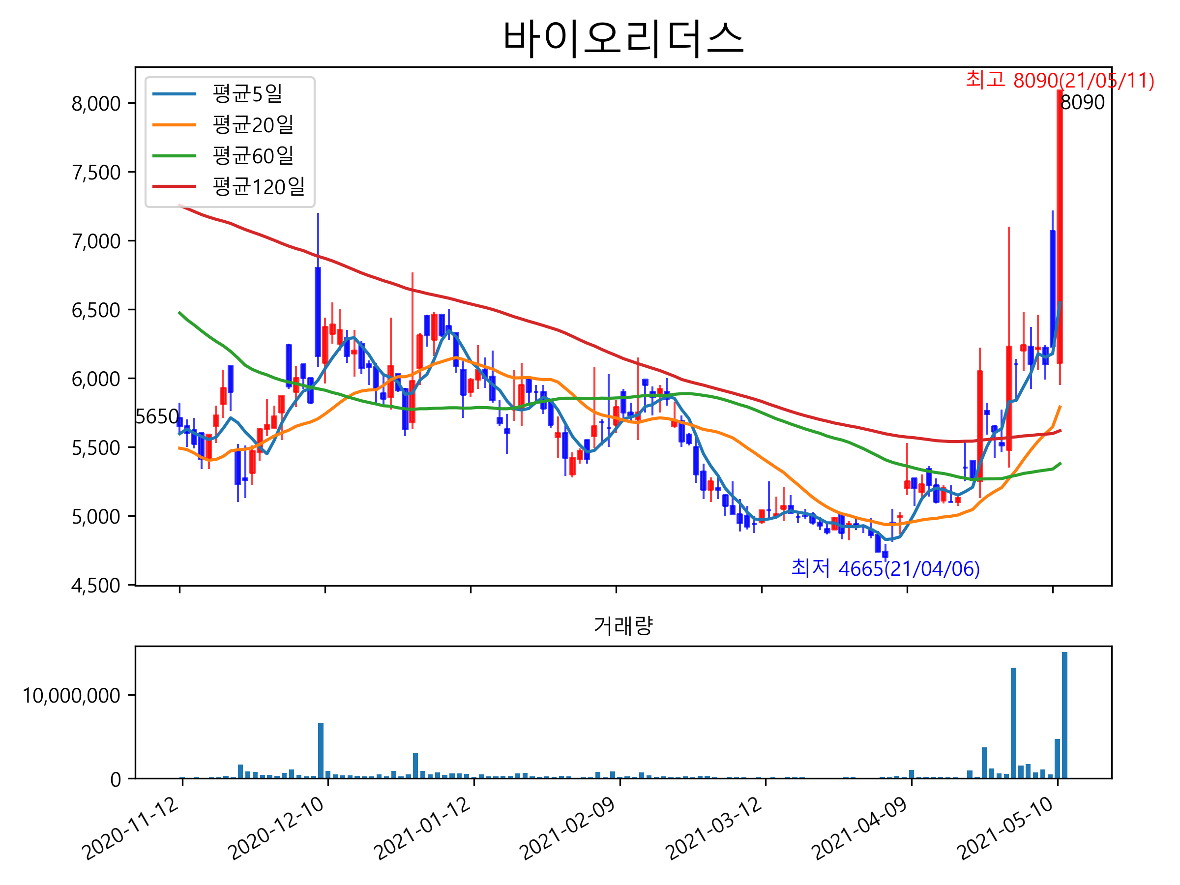 최근 6개월간 캔들차트 및 이동평균선입니다.