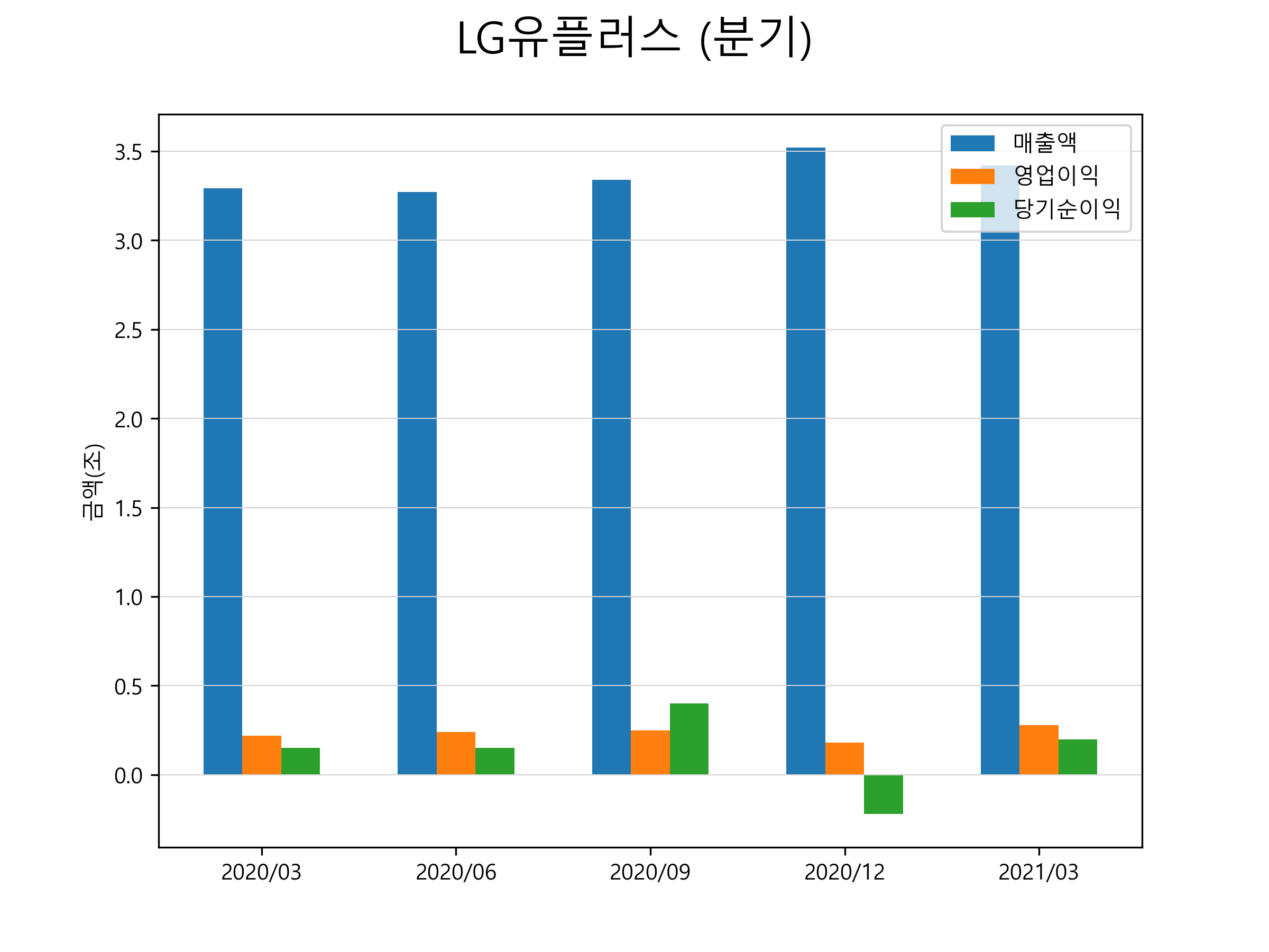 LG유플러스의 2021년 1분기 매출은 3조 4168억원, 영업이익 2756억원, 당기순이익 2009억원을 기록했습니다. 분기별 매출 및 영업이익, 당기순이익 표입니다.