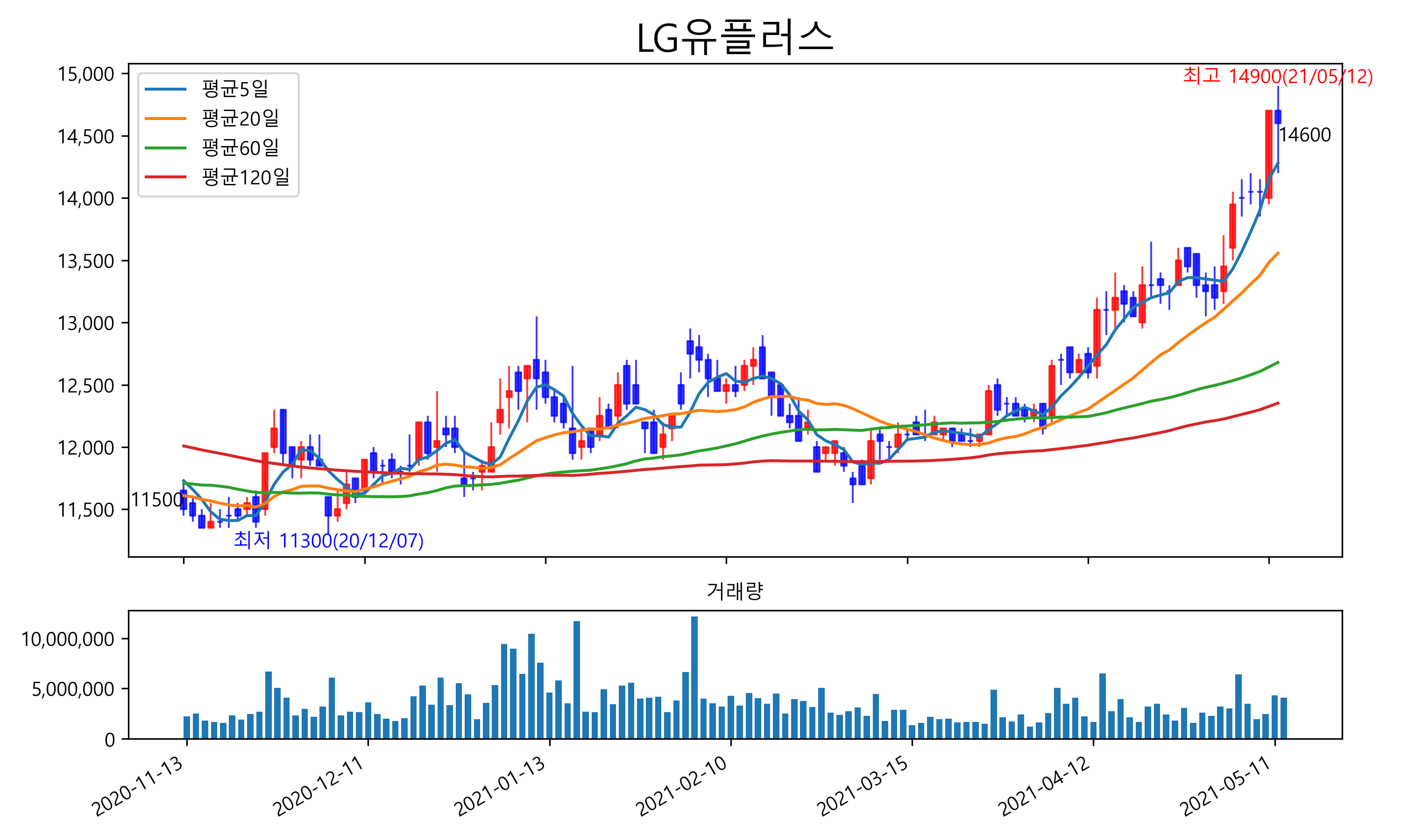 최근 6개월간 캔들차트 및 이동평균선입니다.