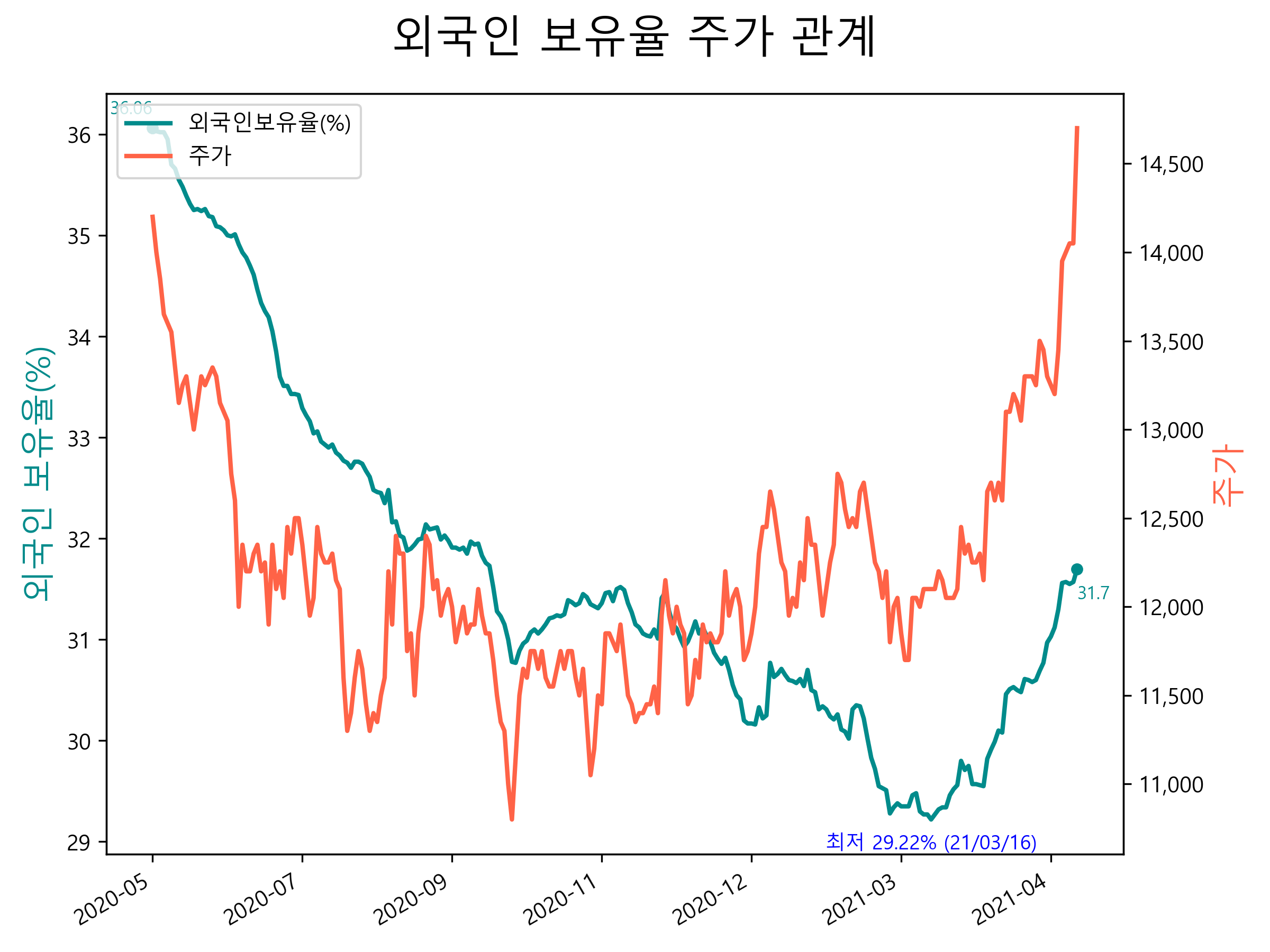 최근 1년간 외국인 보유율 및 주가와의 관계입니다.