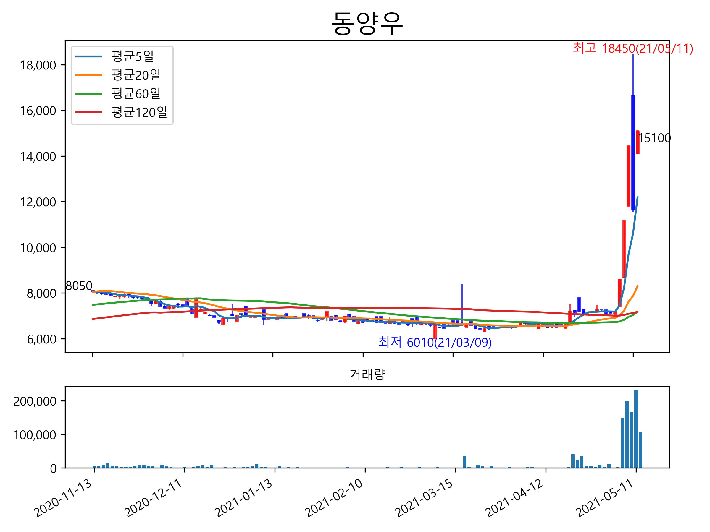 최근 6개월간 캔들차트 및 이동평균선입니다.