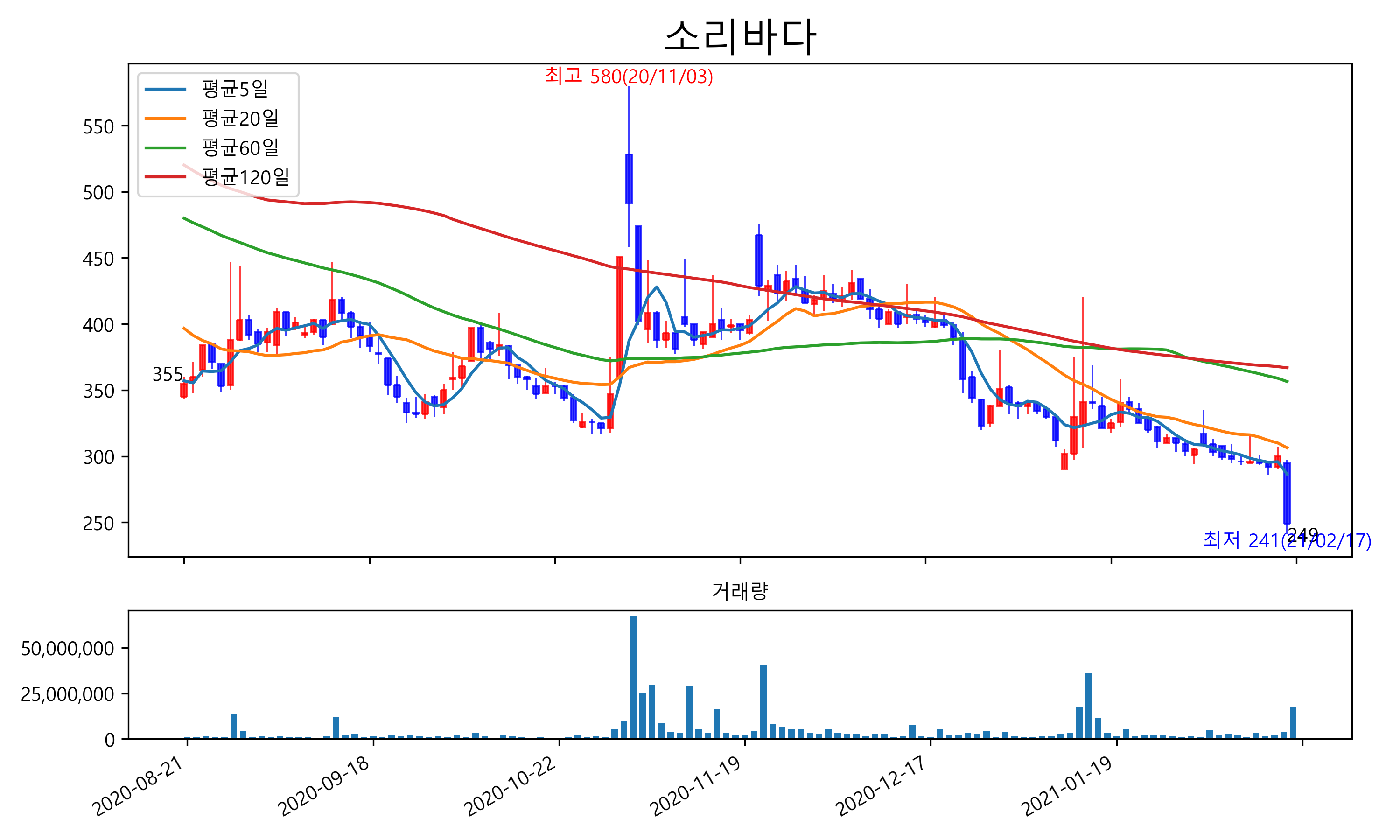 최근 6개월간 캔들차트 및 이동평균선입니다.