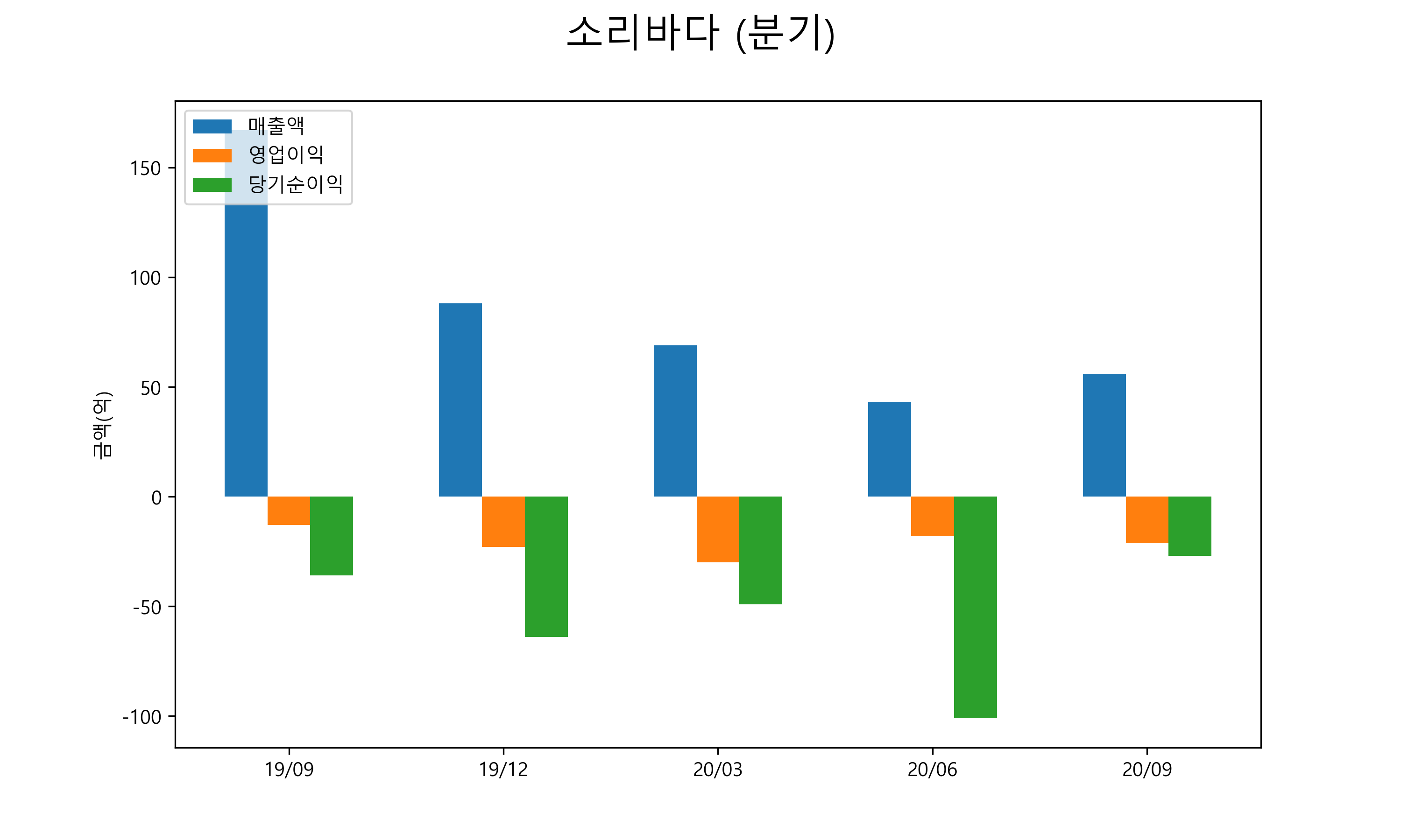 소리바다의 2020년 3분기 매출은 56억원, 영업손실 -21억원, 당기순손실 -27억원을 기록했습니다. 소리바다의 분기별 매출 및 영업이익, 당기순이익 표입니다.