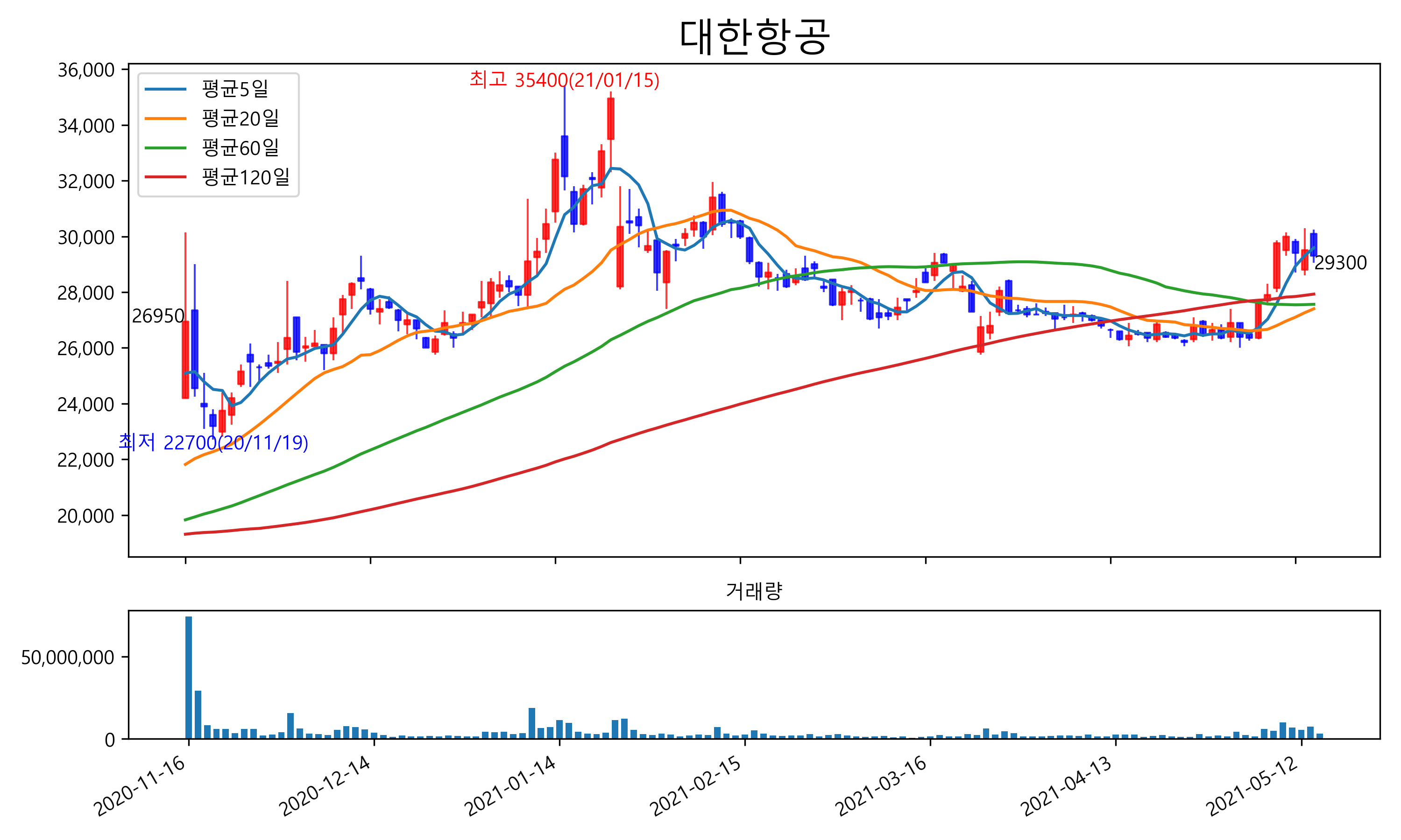 최근 6개월간 캔들차트 및 이동평균선입니다.