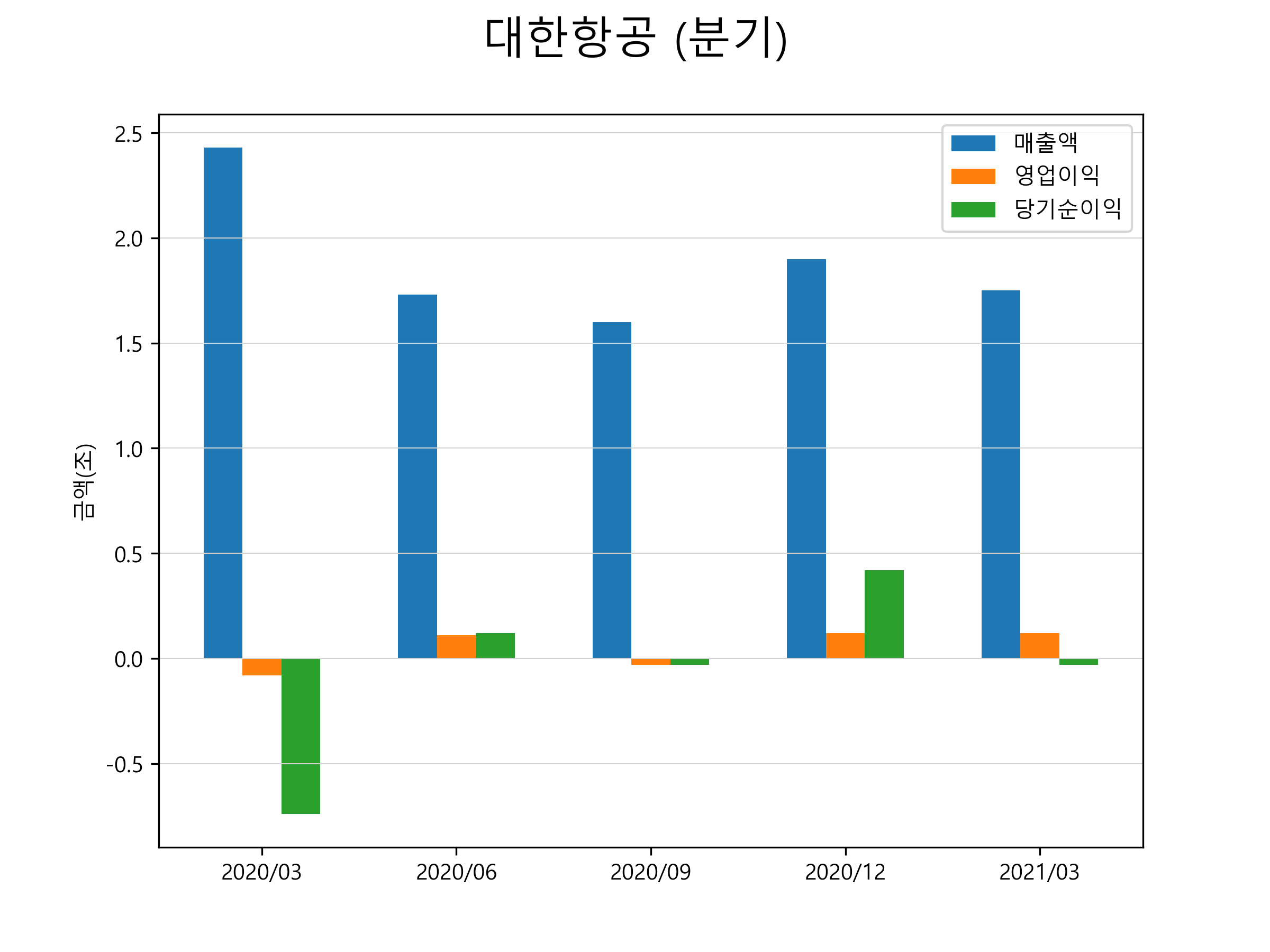 대한항공의 2021년 1분기 매출은 1조 7498억원, 영업이익 1245억원, 당기순손실 -288억원을 기록했습니다. 분기별 매출 및 영업이익, 당기순이익 표입니다.