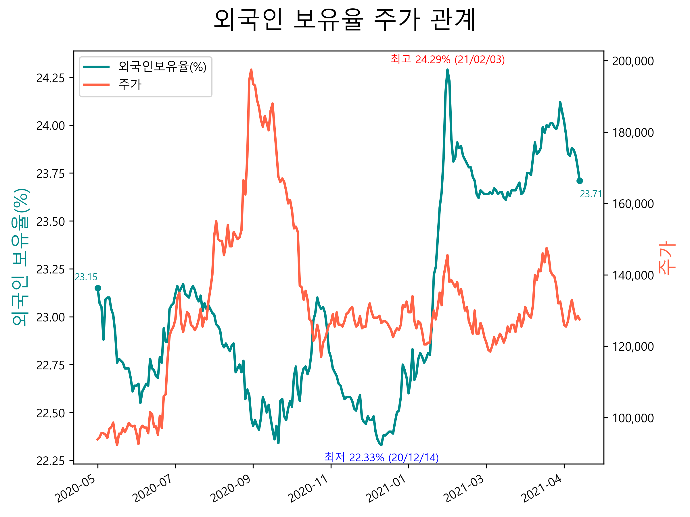최근 1년간 외국인 보유율 및 주가와의 관계입니다.