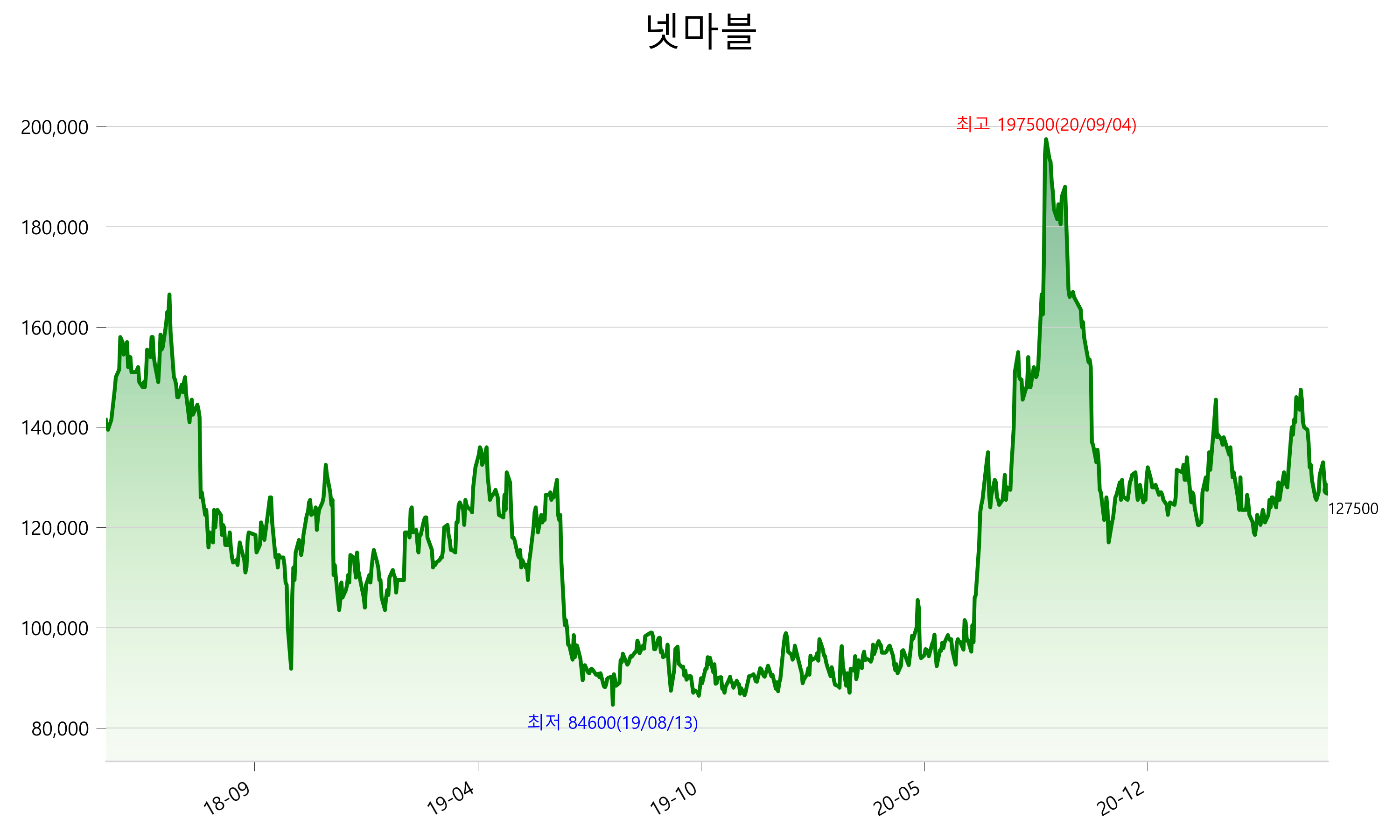 52주 최고가는 197,500원(2020-09-04), 52주 최저가는 92,300원(2020-05-29)으로 52주간 변동률은 35.8% 입니다.