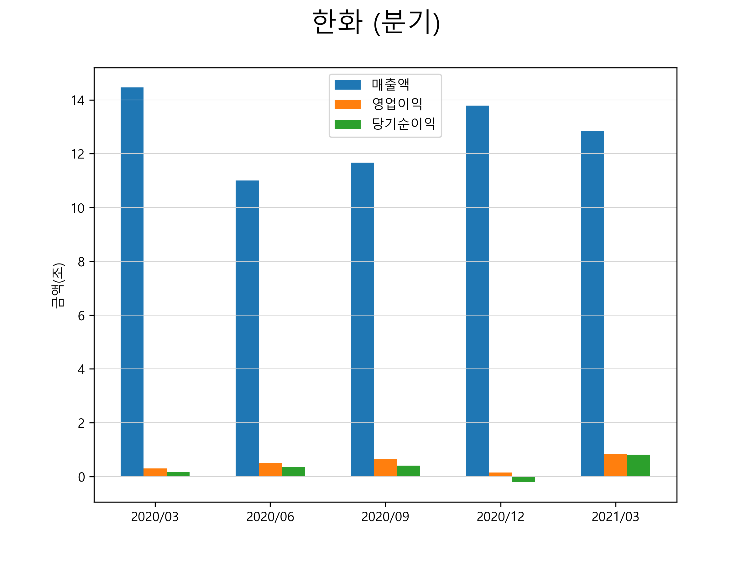 한화의 2021년 1분기 매출은 12조 8382억원, 영업이익 8485억원, 당기순이익 8199억원을 기록했습니다. 분기별 매출 및 영업이익, 당기순이익 표입니다.