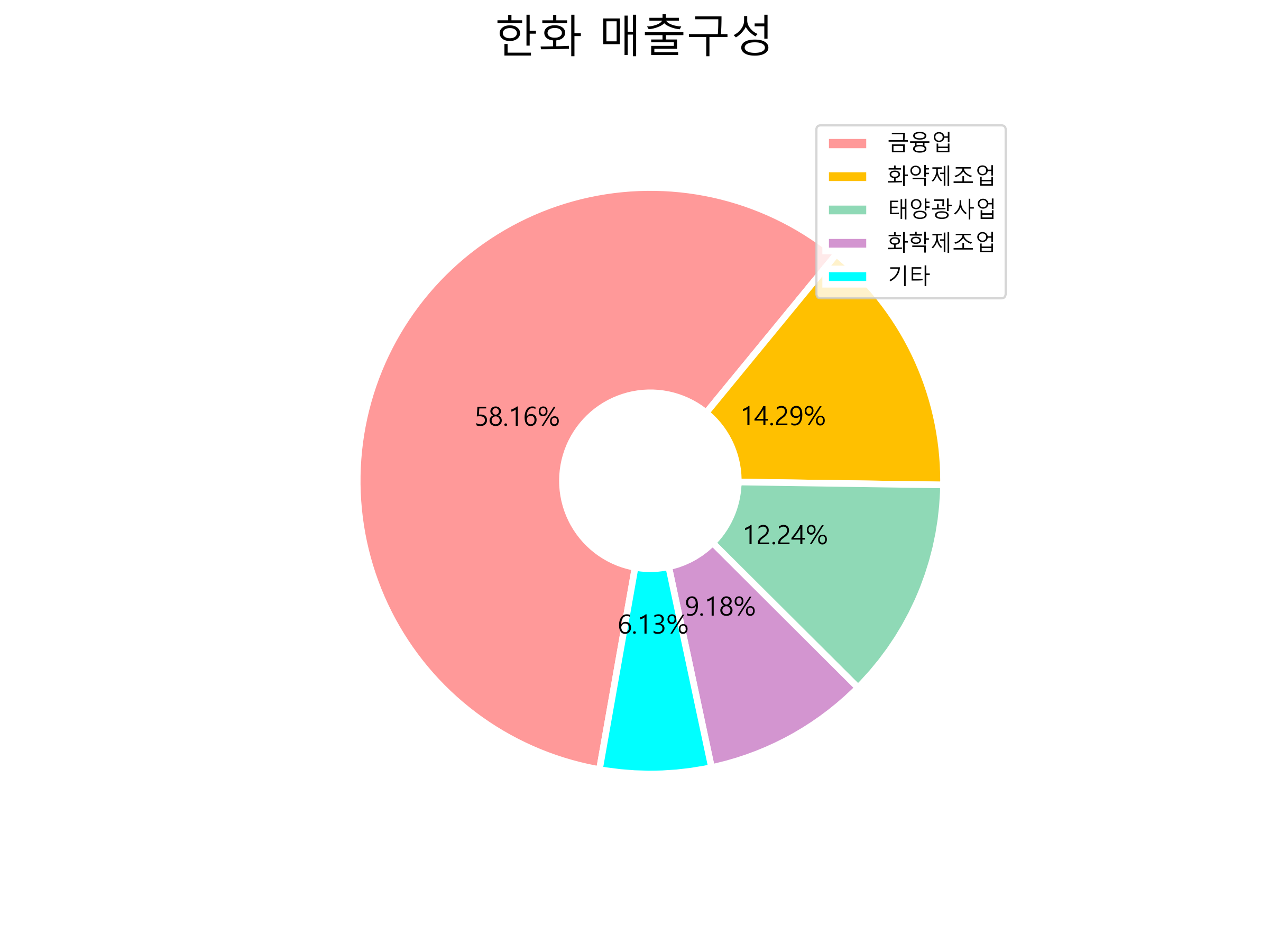 - 한화그룹의 지주회사 역할을 하고 있으며 한화생명, 한화에어로스페이스, 한화케미칼 등 계열사 지분 보유, 자체사업은 화약/방산/기계/무역 부문이 있음.
