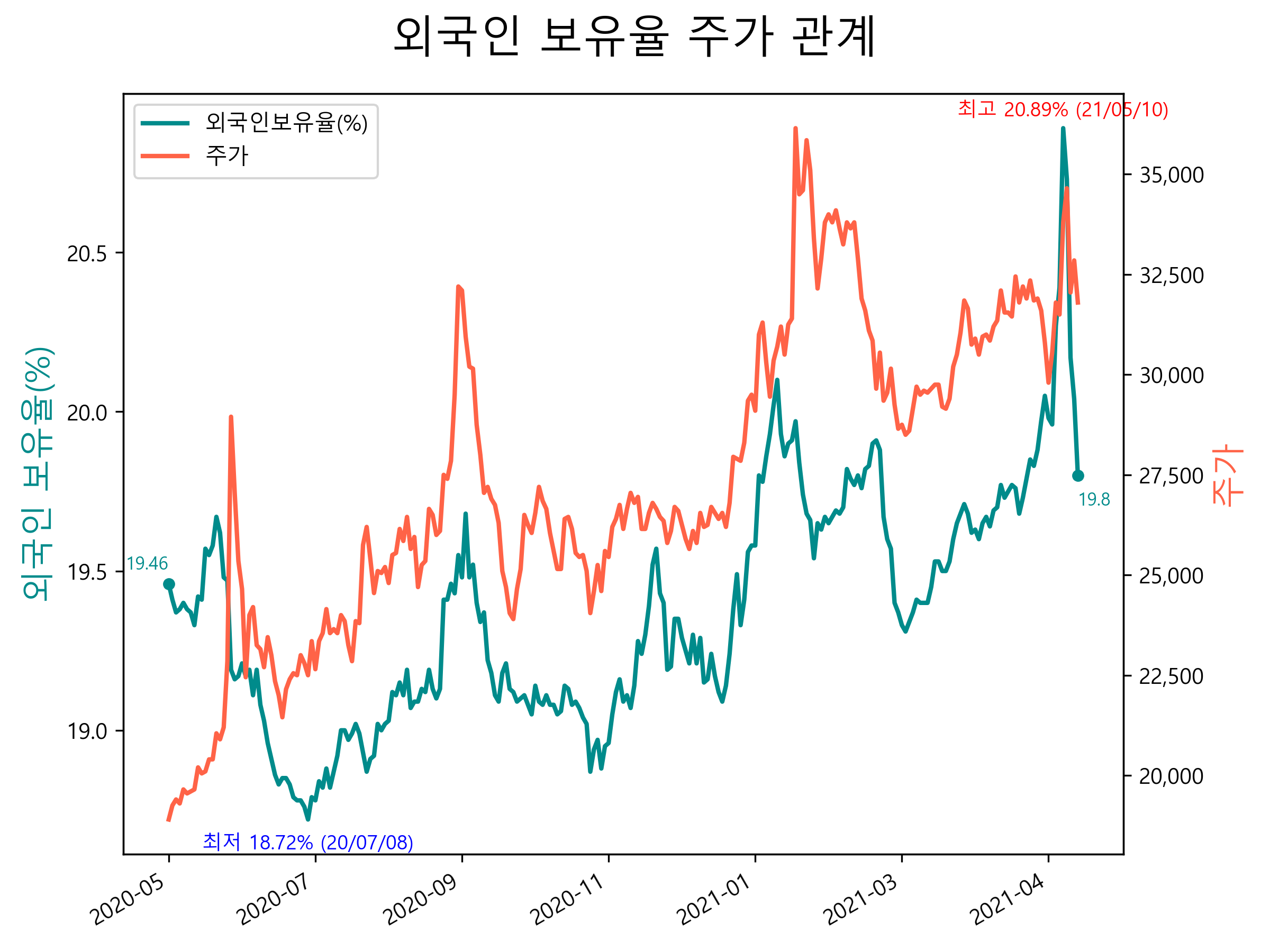 최근 1년간 외국인 보유율 및 주가와의 관계입니다.