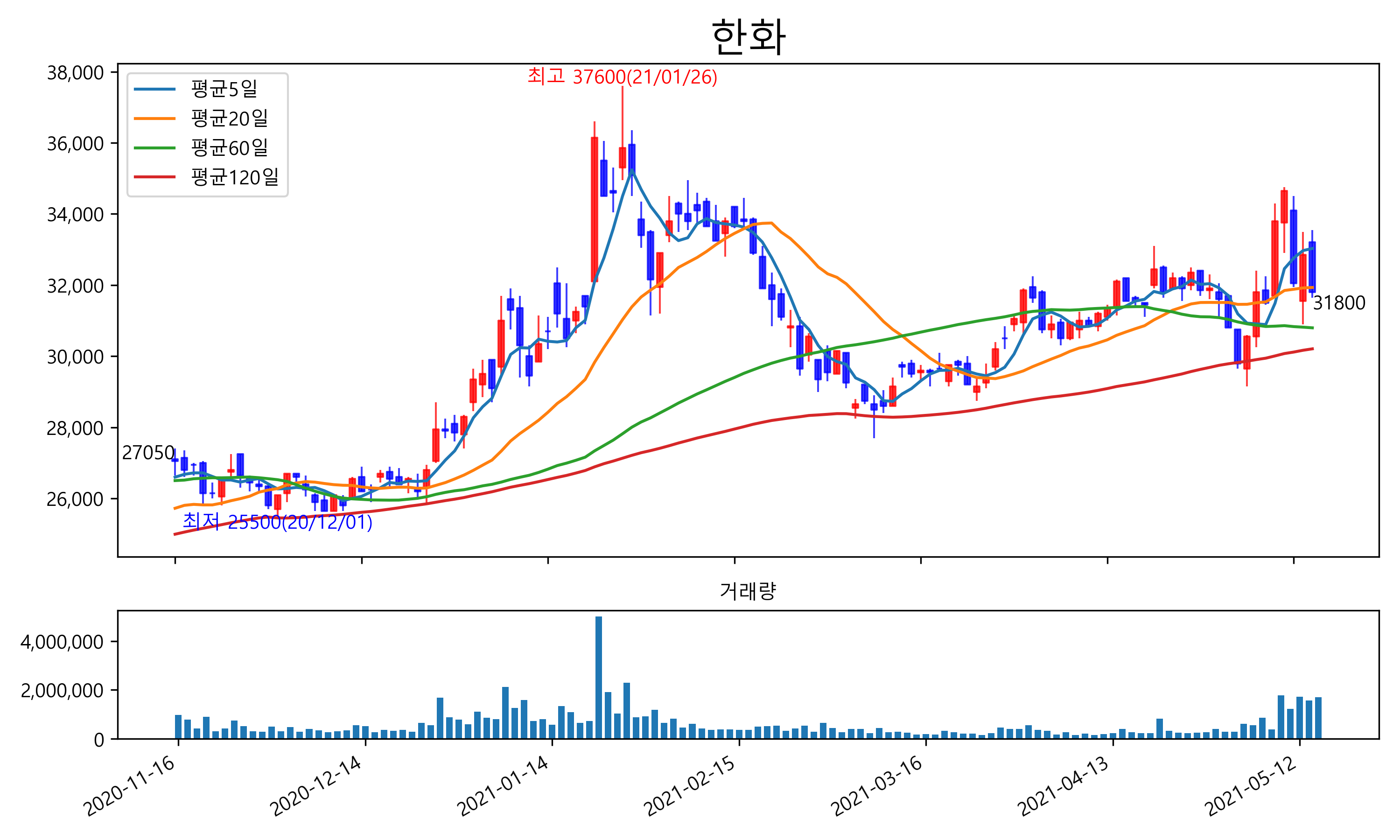 최근 6개월간 캔들차트 및 이동평균선입니다.