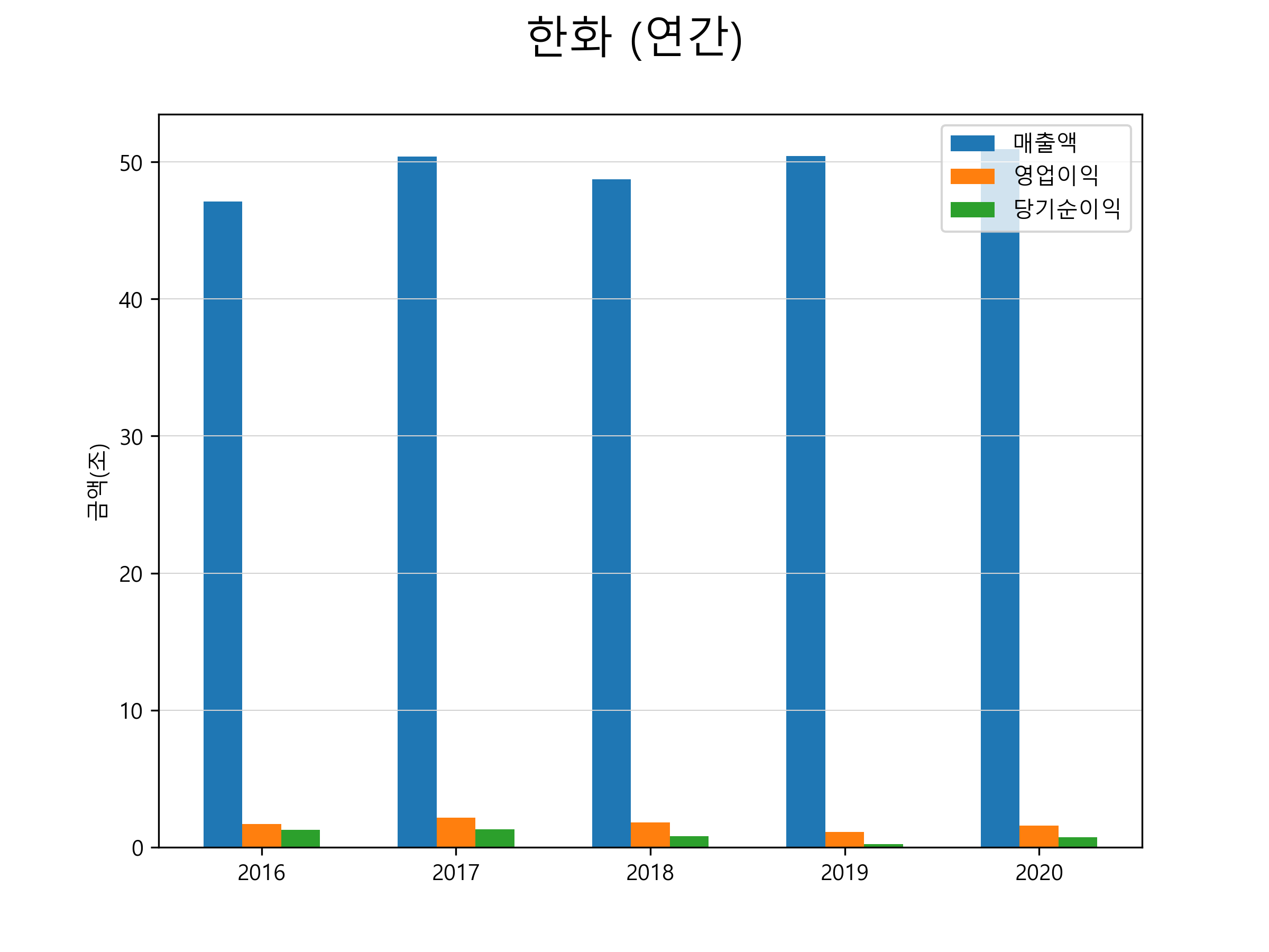 한화의 최근 5년간 실적입니다. 2020년 매출은 50조 9265억원, 영업이익 1조 5820억원, 당기순이익 7405억원을 기록했습니다. 연간 매출 및 영업이익, 당기순이익 표입니다.
