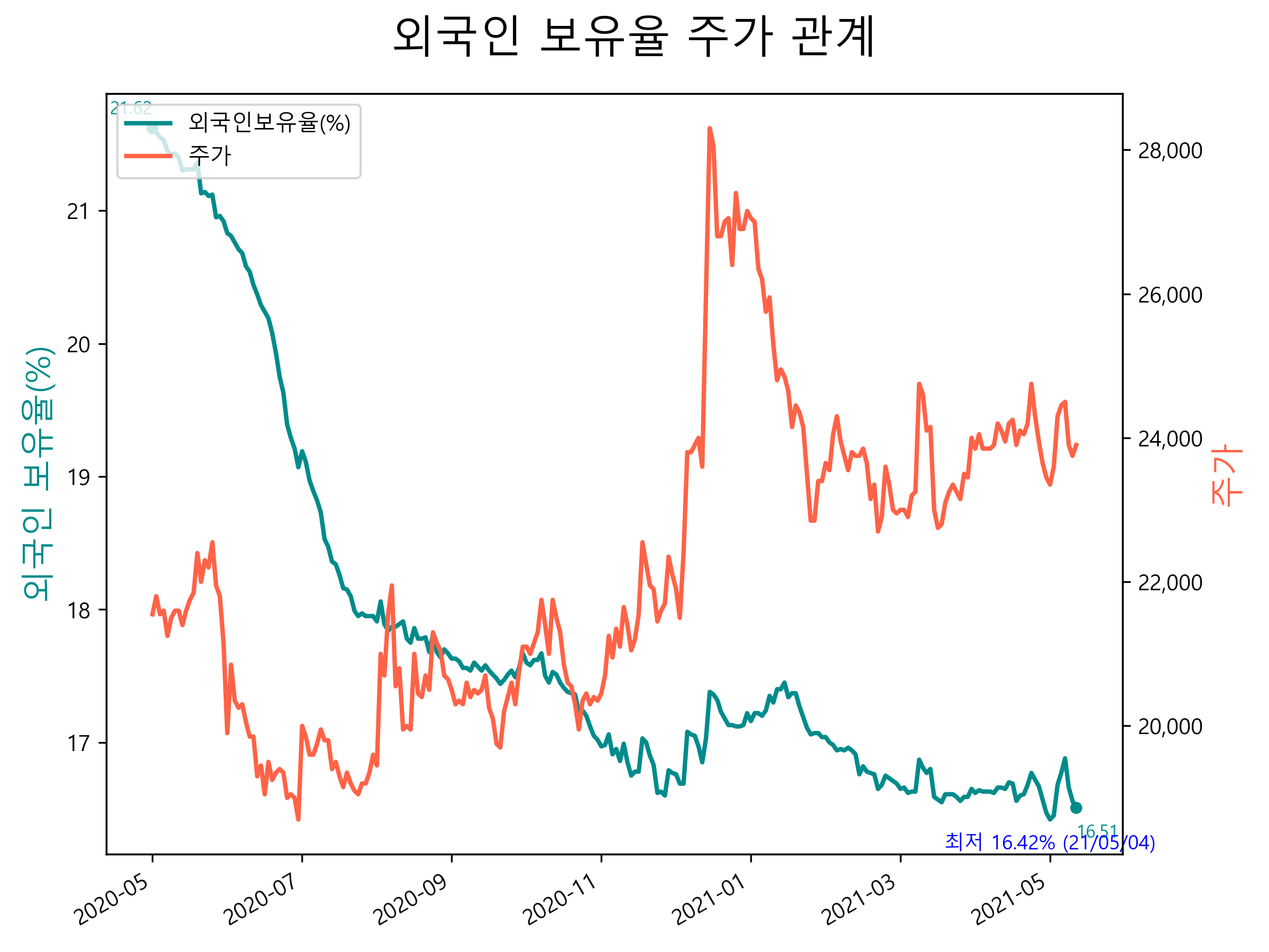 최근 1년간 외국인 보유율 및 주가와의 관계입니다.