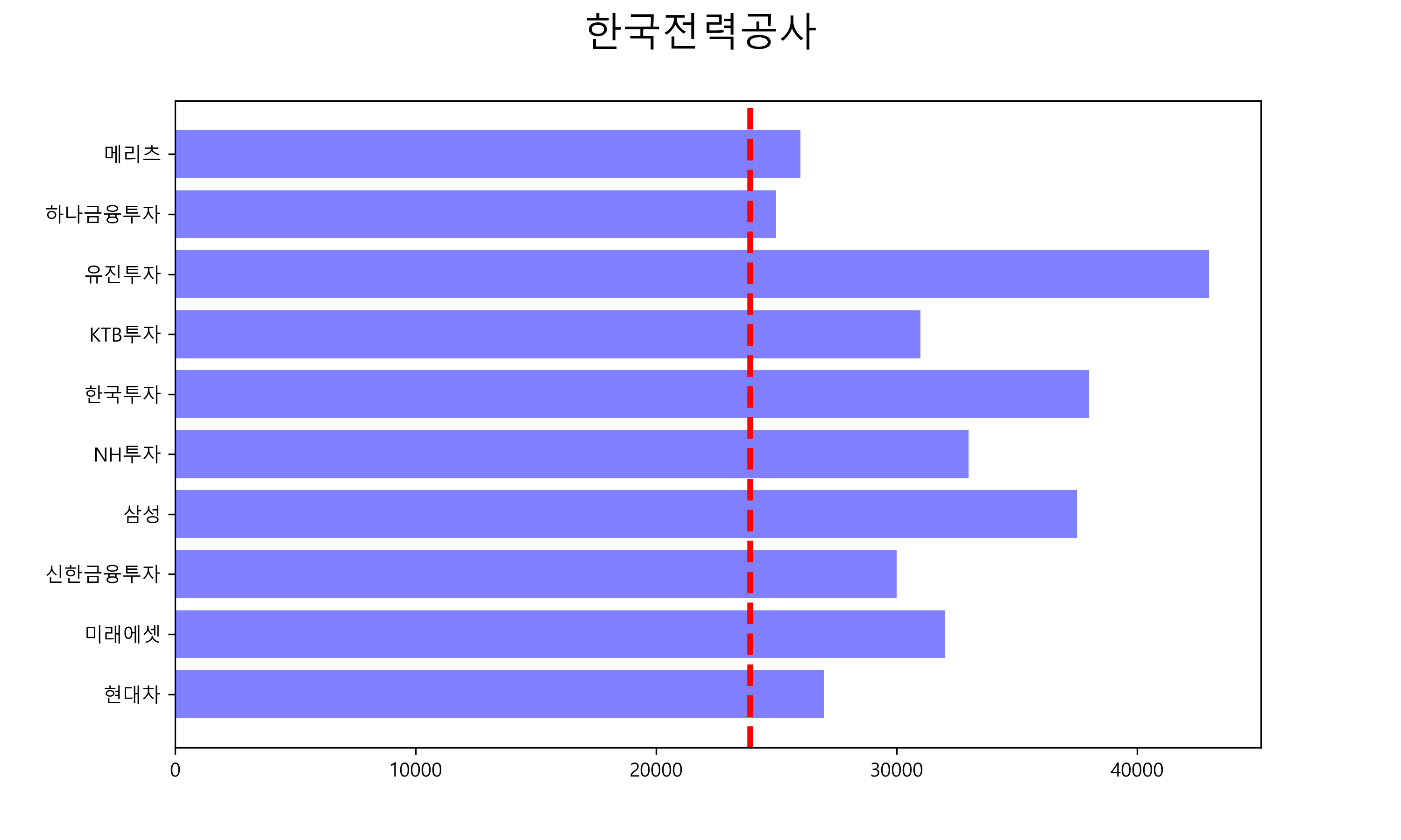 현재 주가보다 상승할 것이라고 예측한 증권사은 10 곳이며 하락할 것이라고 예측한 증권사는 0곳 입니다. 한국전력의 5월 15일 기준 현재 주가로 23,900원 입니다. 목표주가 평균추정치는 32,250원 으로 현재 주가 대비 34.9% 높습니다.