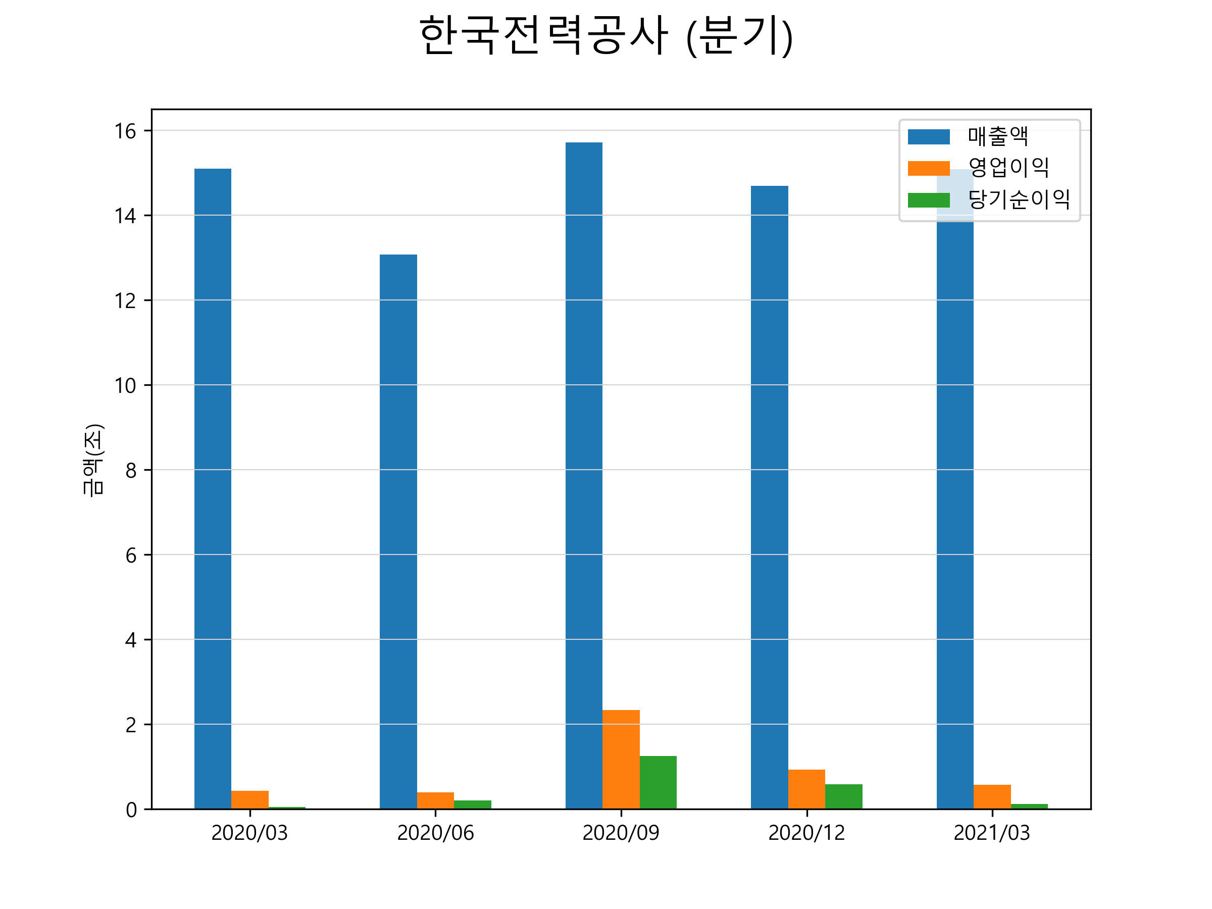 한국전력의 2021년 1분기 매출은 15조 753억원, 영업이익 5716억원, 당기순이익 1184억원을 기록했습니다. 분기별 매출 및 영업이익, 당기순이익 표입니다.