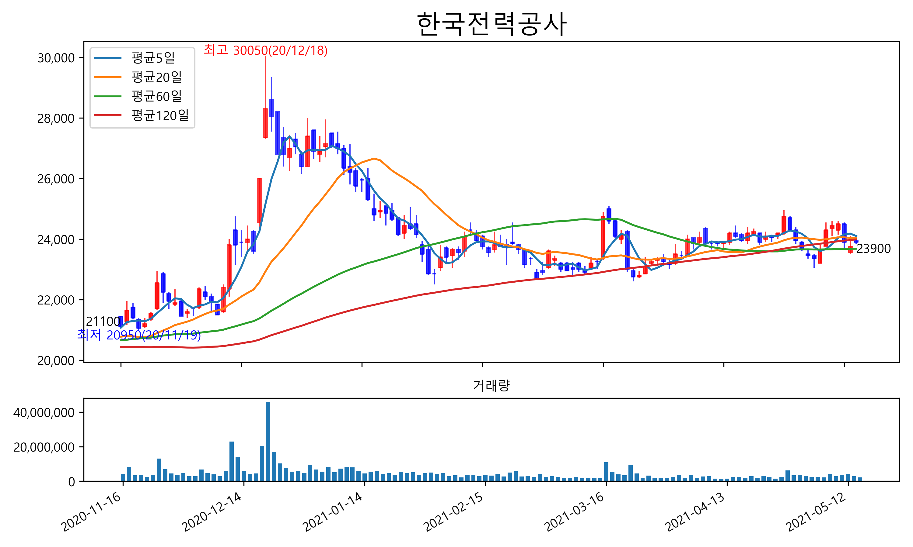 최근 6개월간 캔들차트 및 이동평균선입니다.